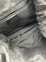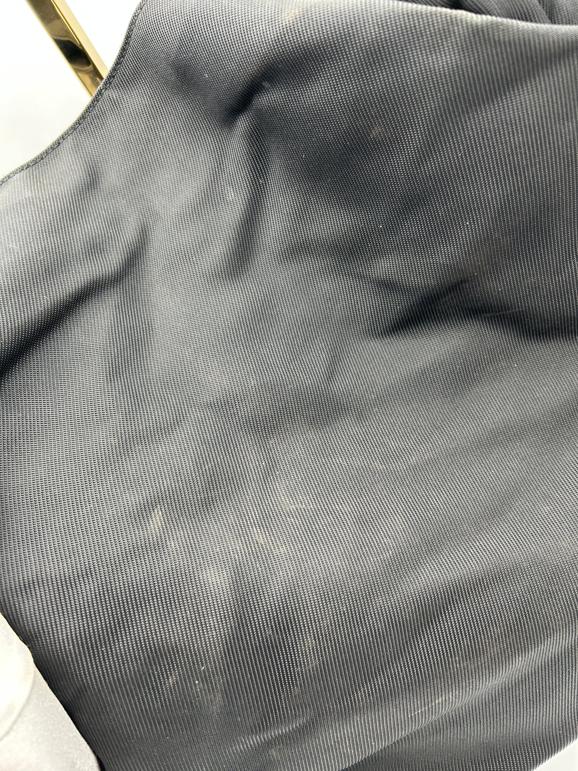 The exterior of the bag has some light staining. The Bamboo top handle has some dents and scratches. The metal hardware has some slight discolouration. The inside is very clean.