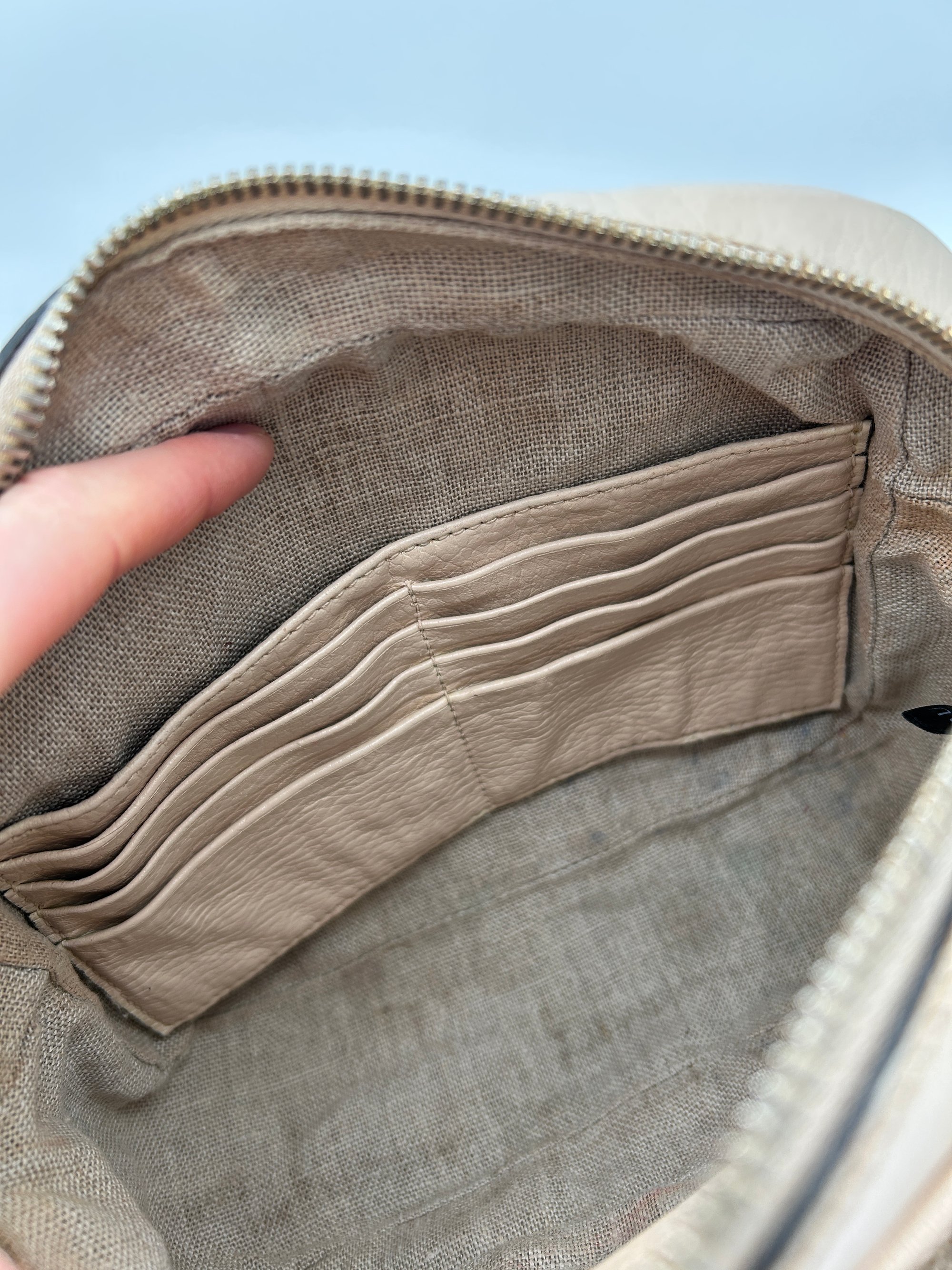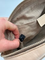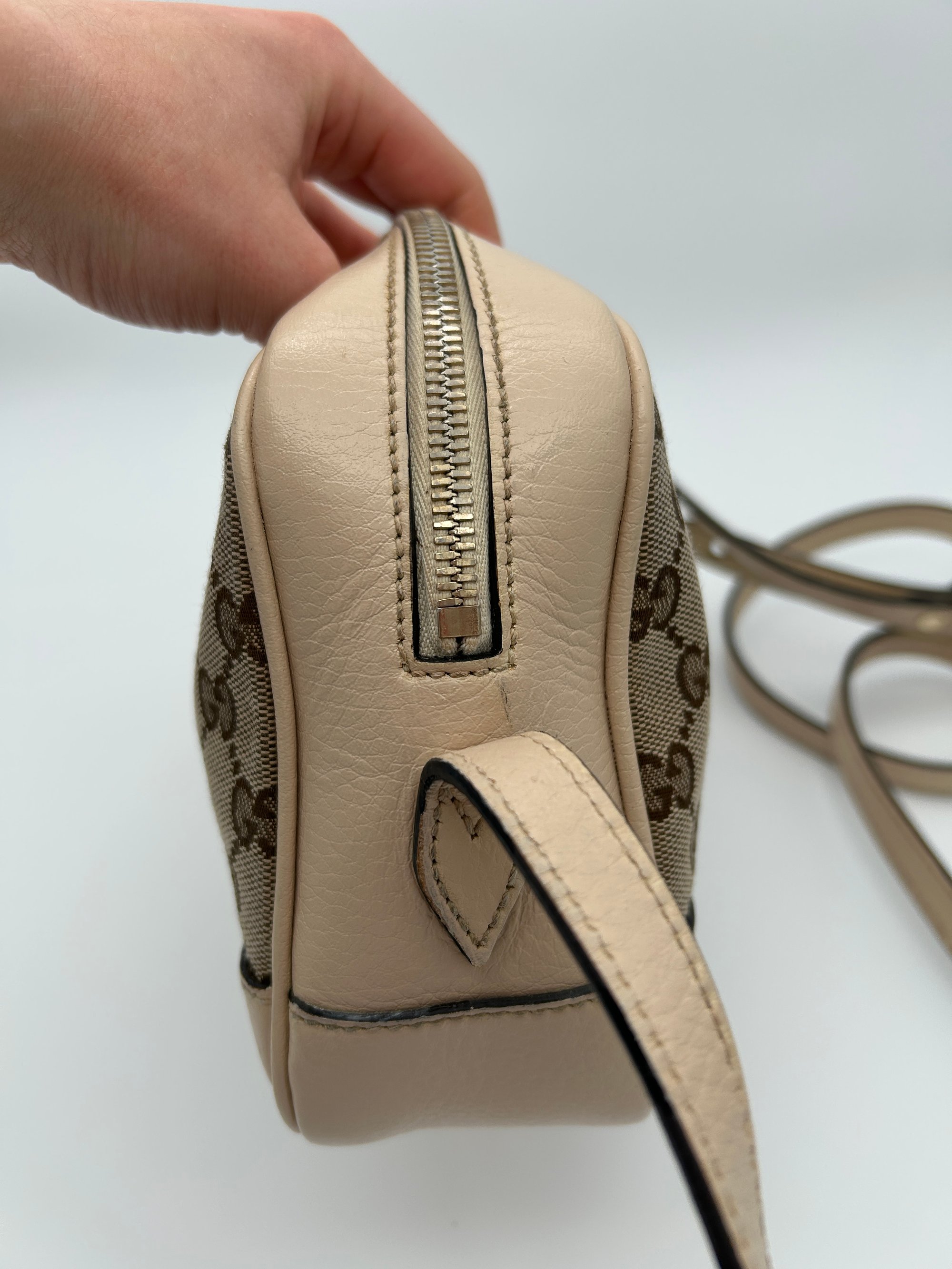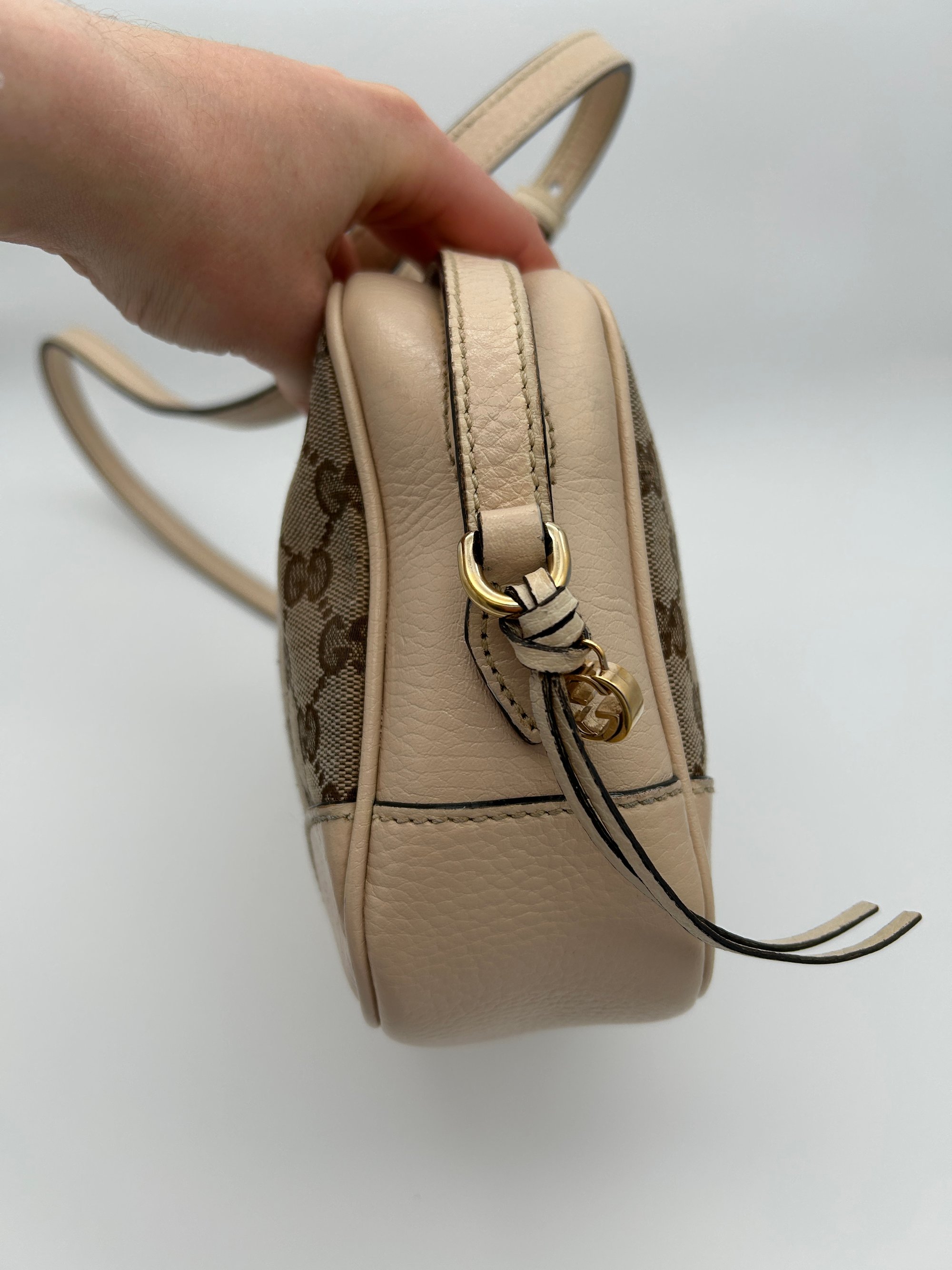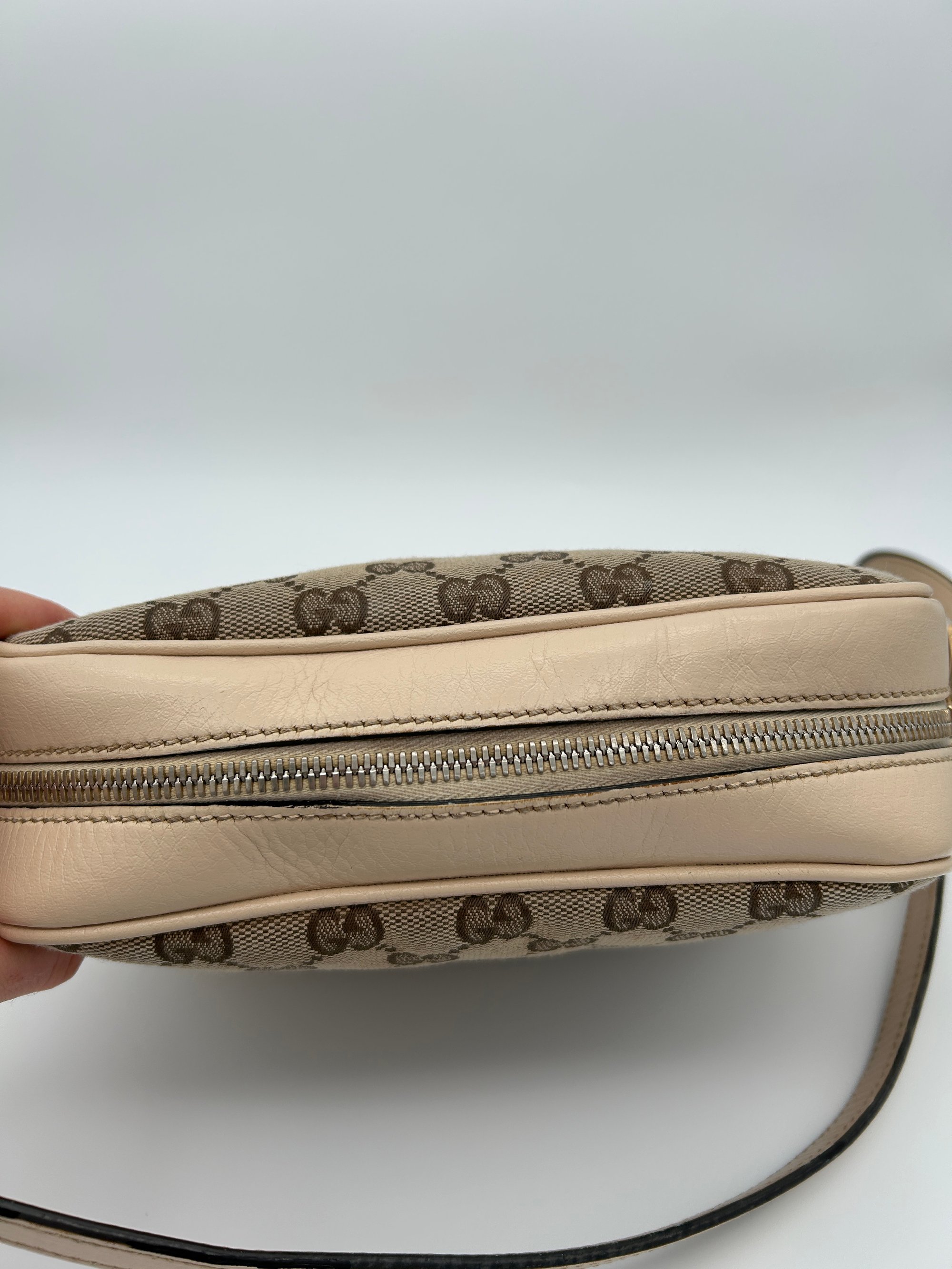 This bag is in very good shape. There is some slight creasing on the leather next to the zipper. The GG canvas has no marks or tears. The bottom corners have some minor rubbing. The inside has a couple of light pink marks inside. The strap has some slight creasing.
