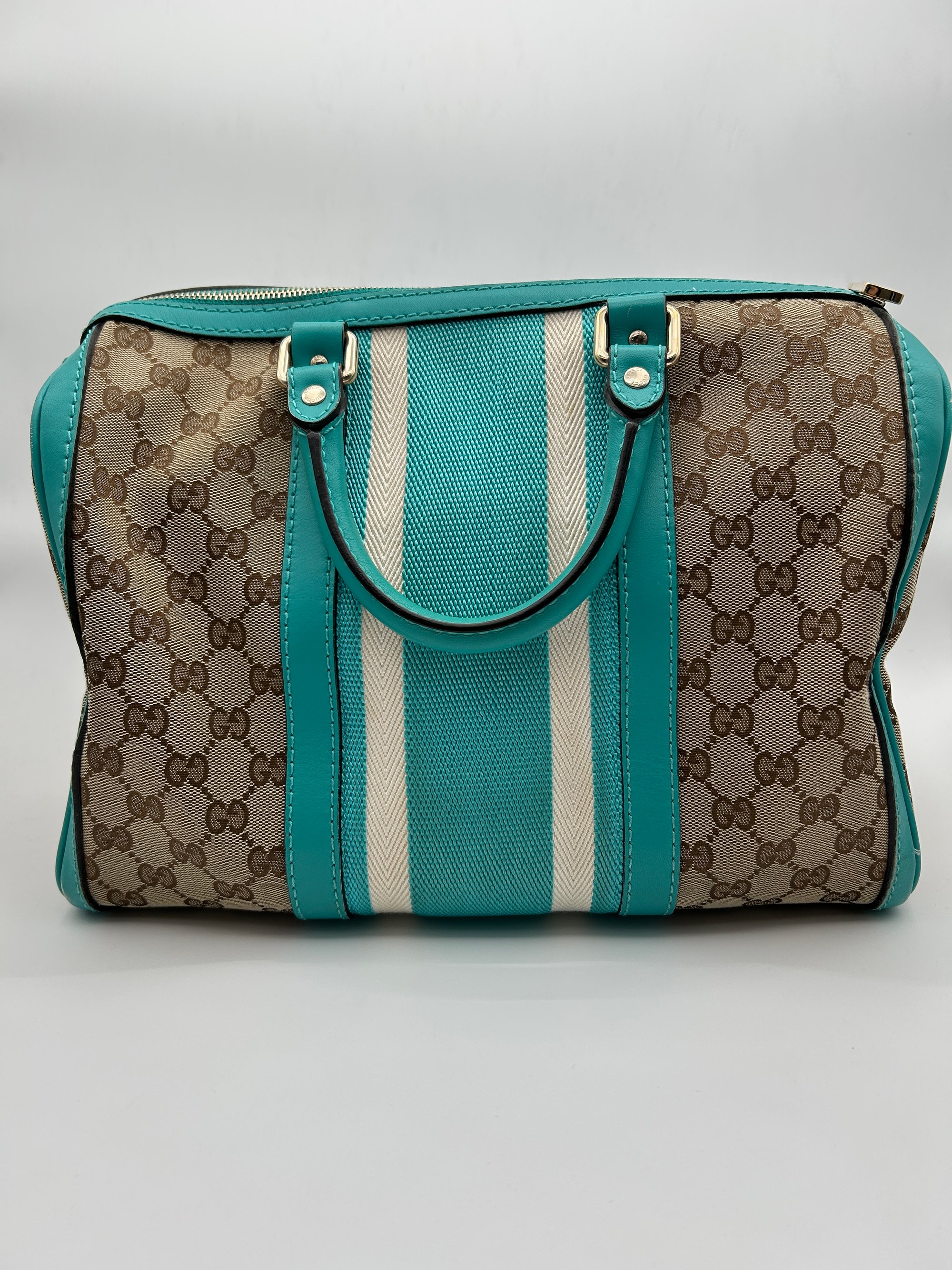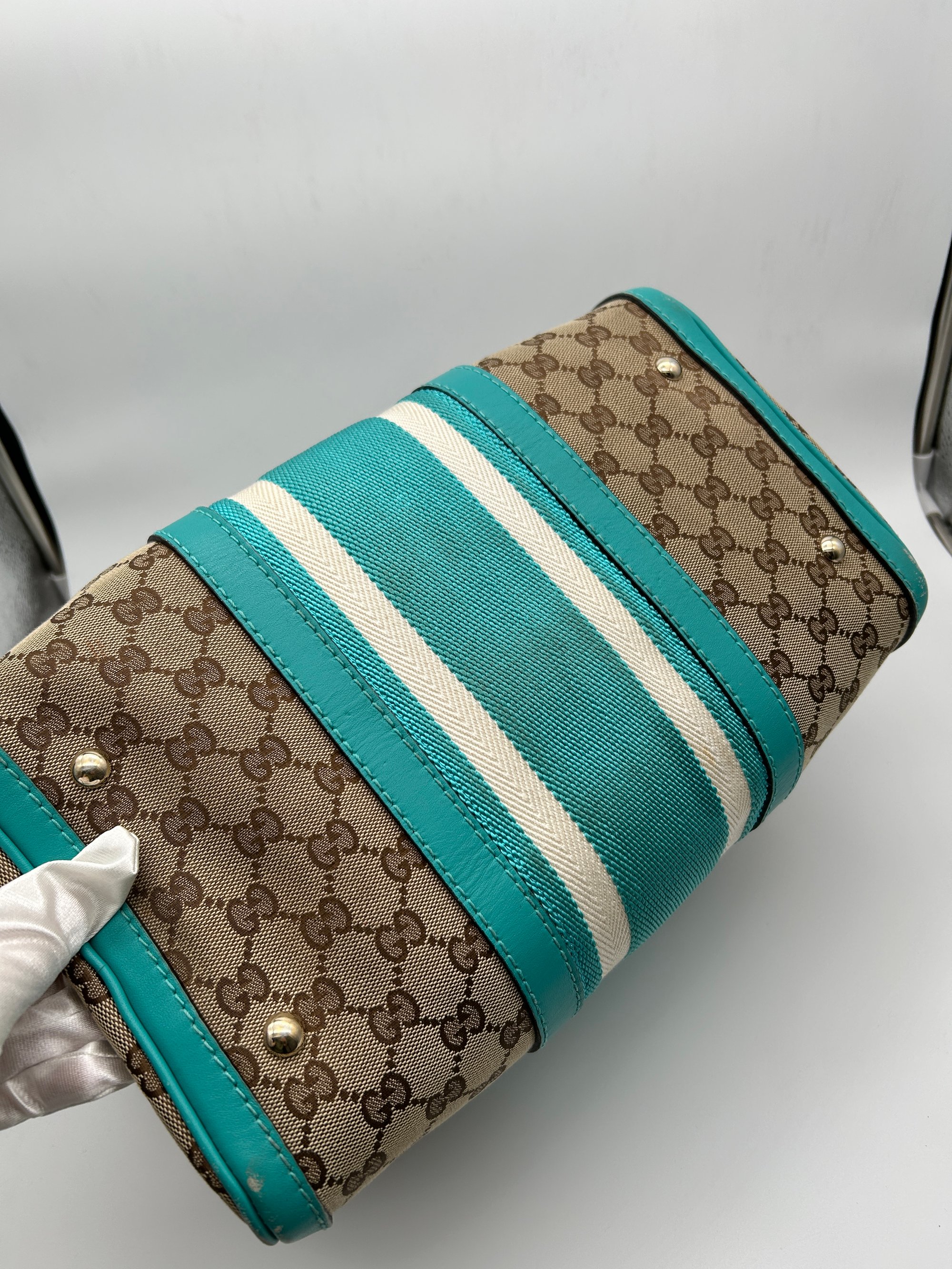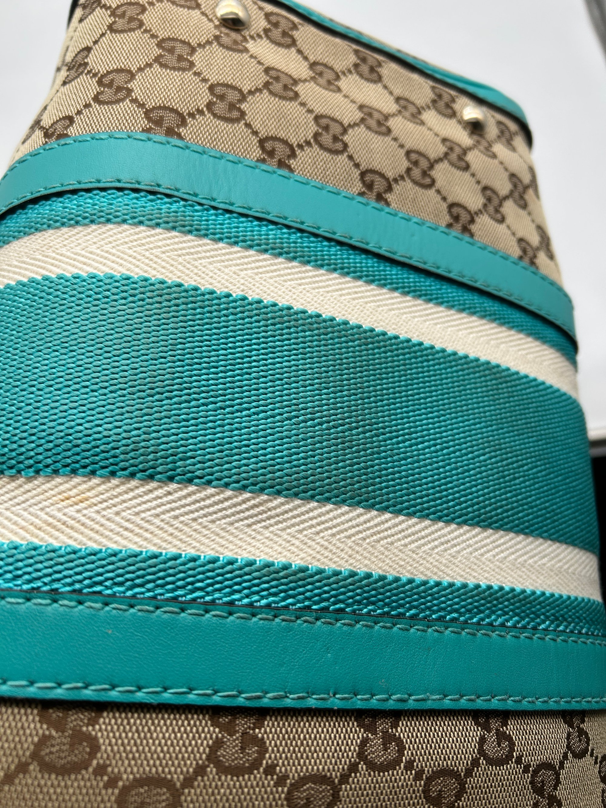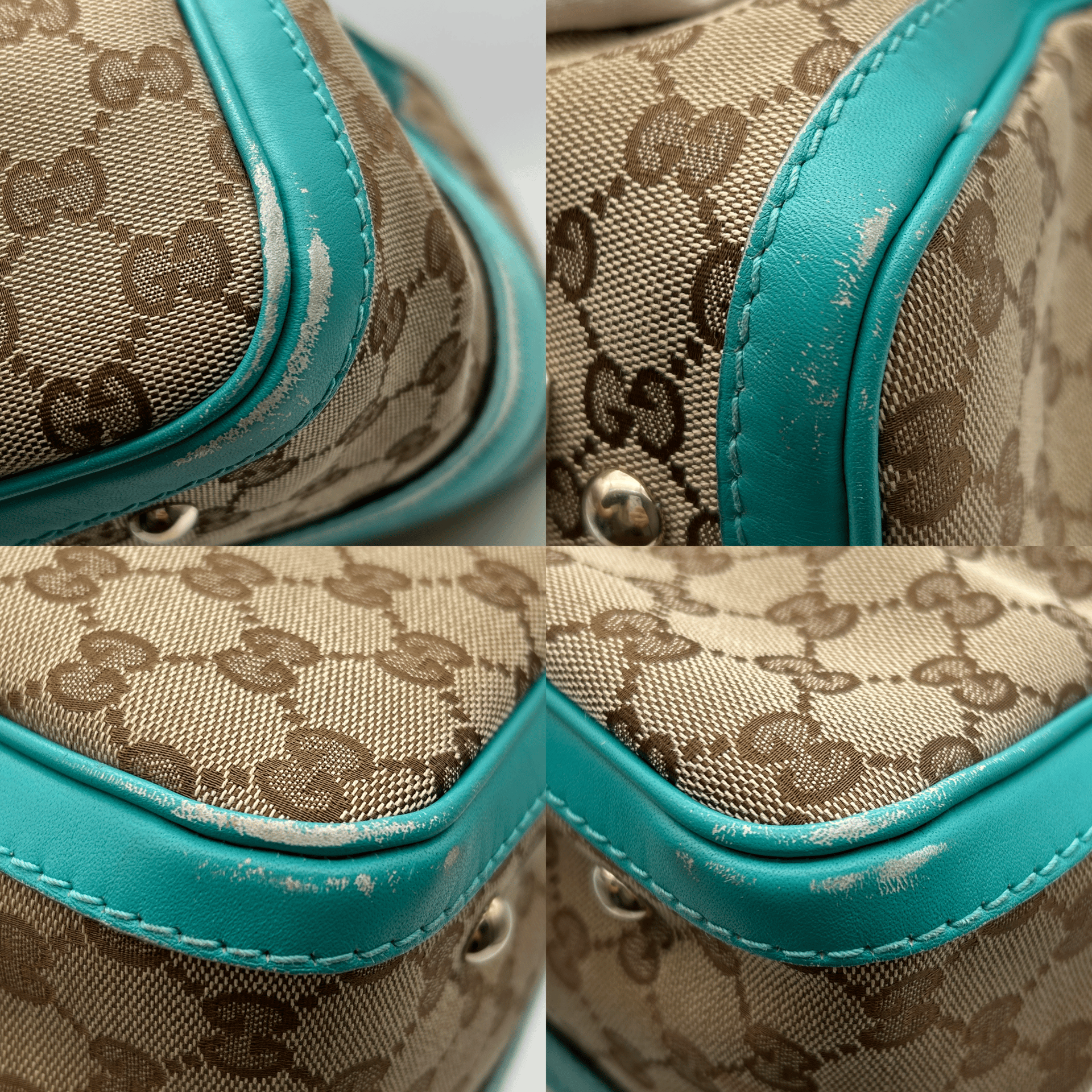 The canvas is free of any tears or holes. The metal hardware has some slight discolouration. All four bottom corners have some scuffing on the leather. The leather handles have a few small scratches. The material on the base of the bag has some water staining. The inside is very clean and has no odour but does have one stain around the opening of the bag.