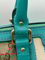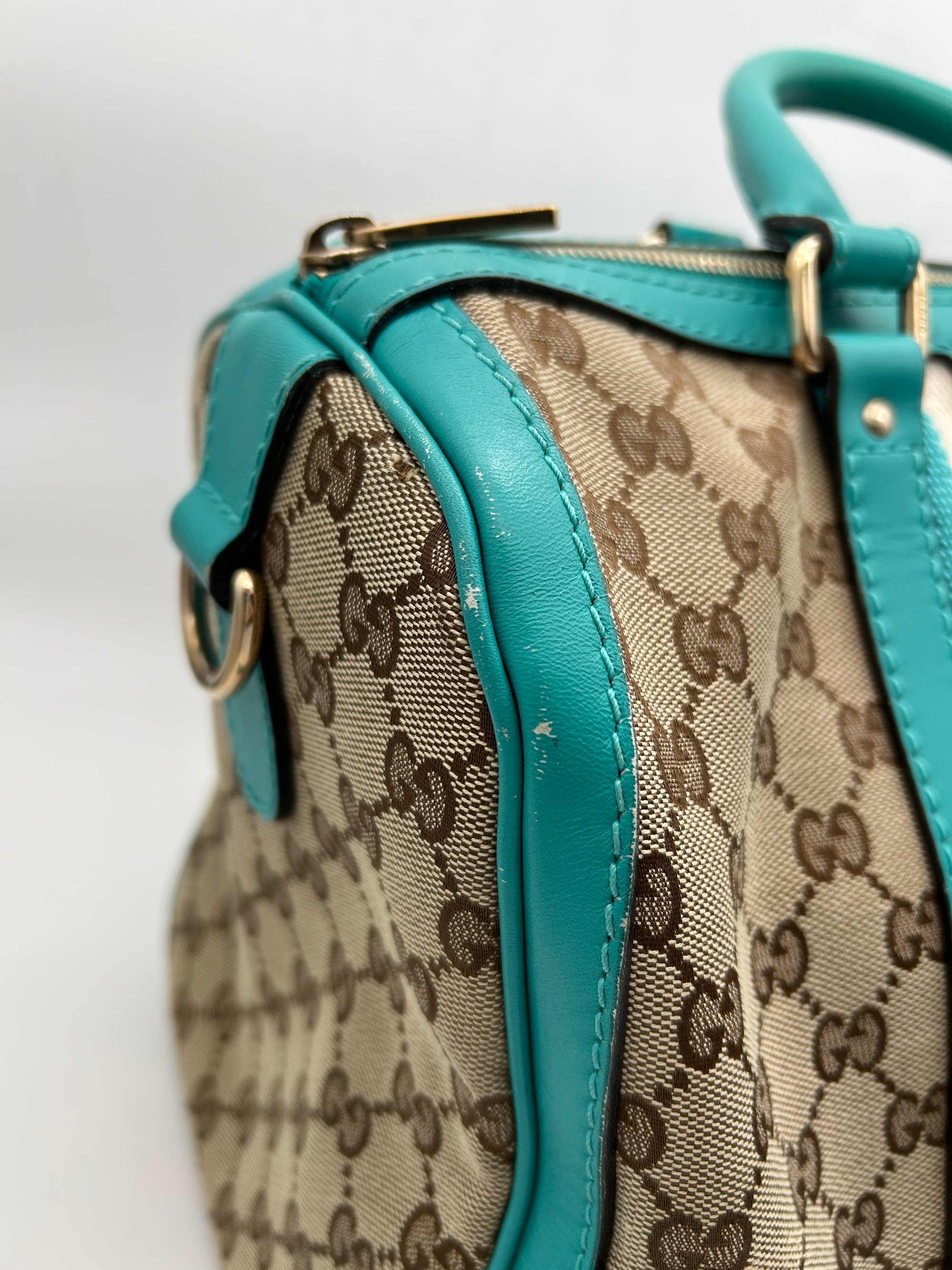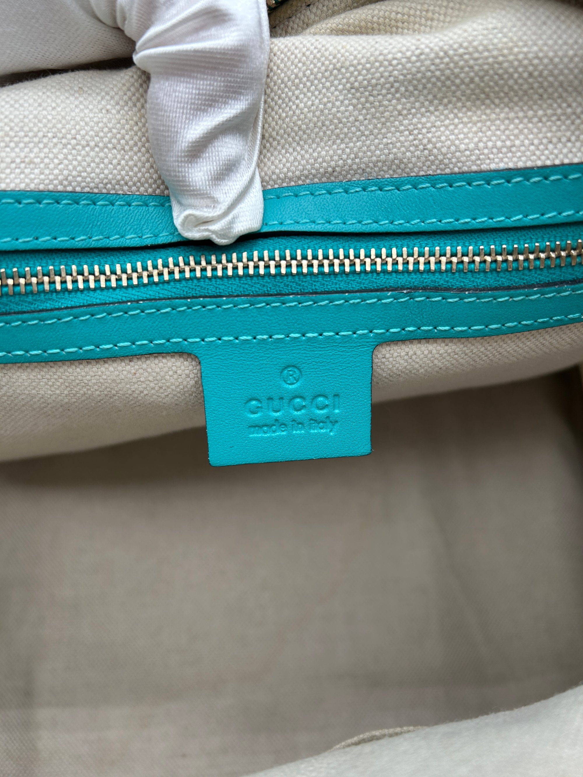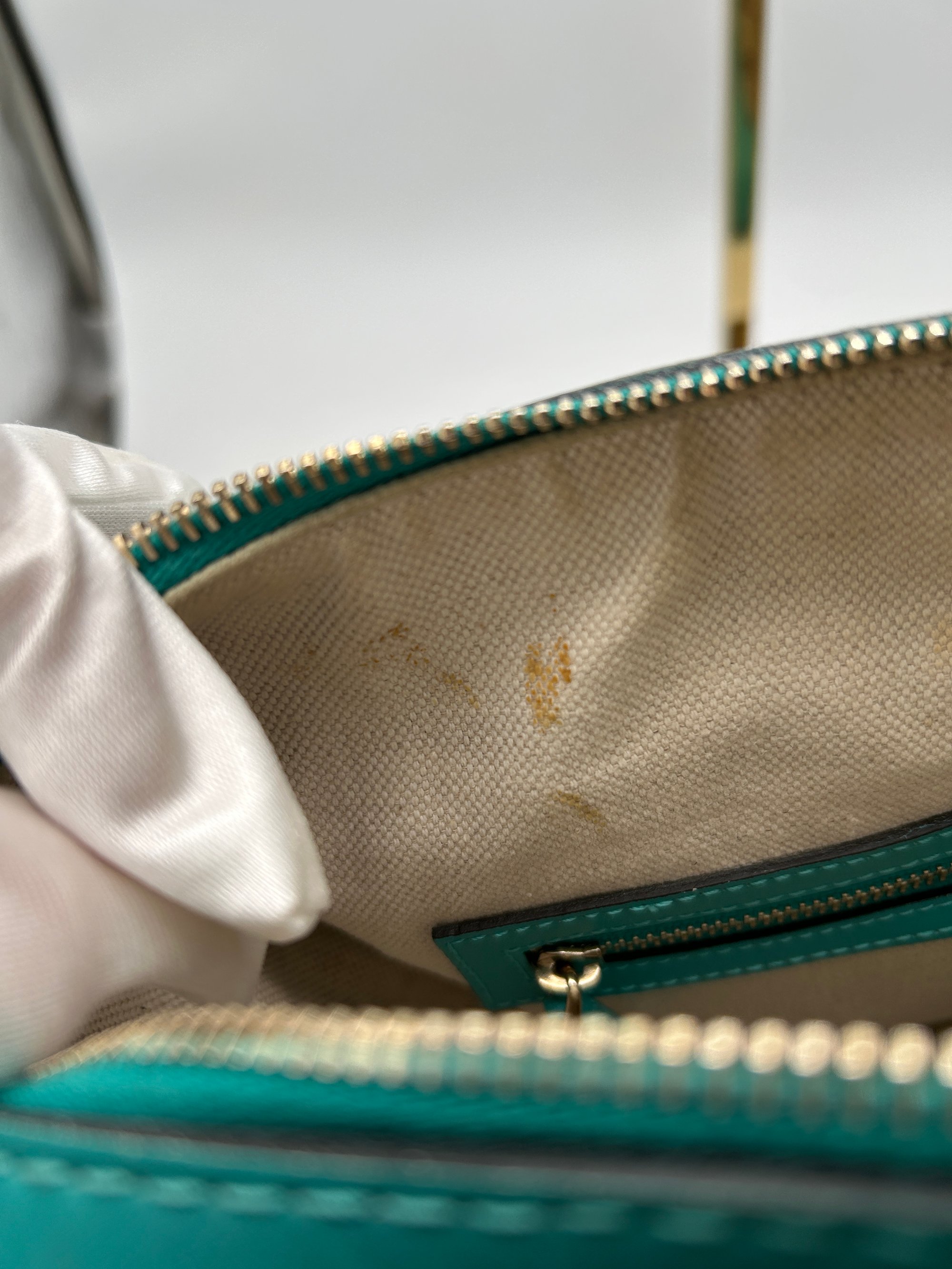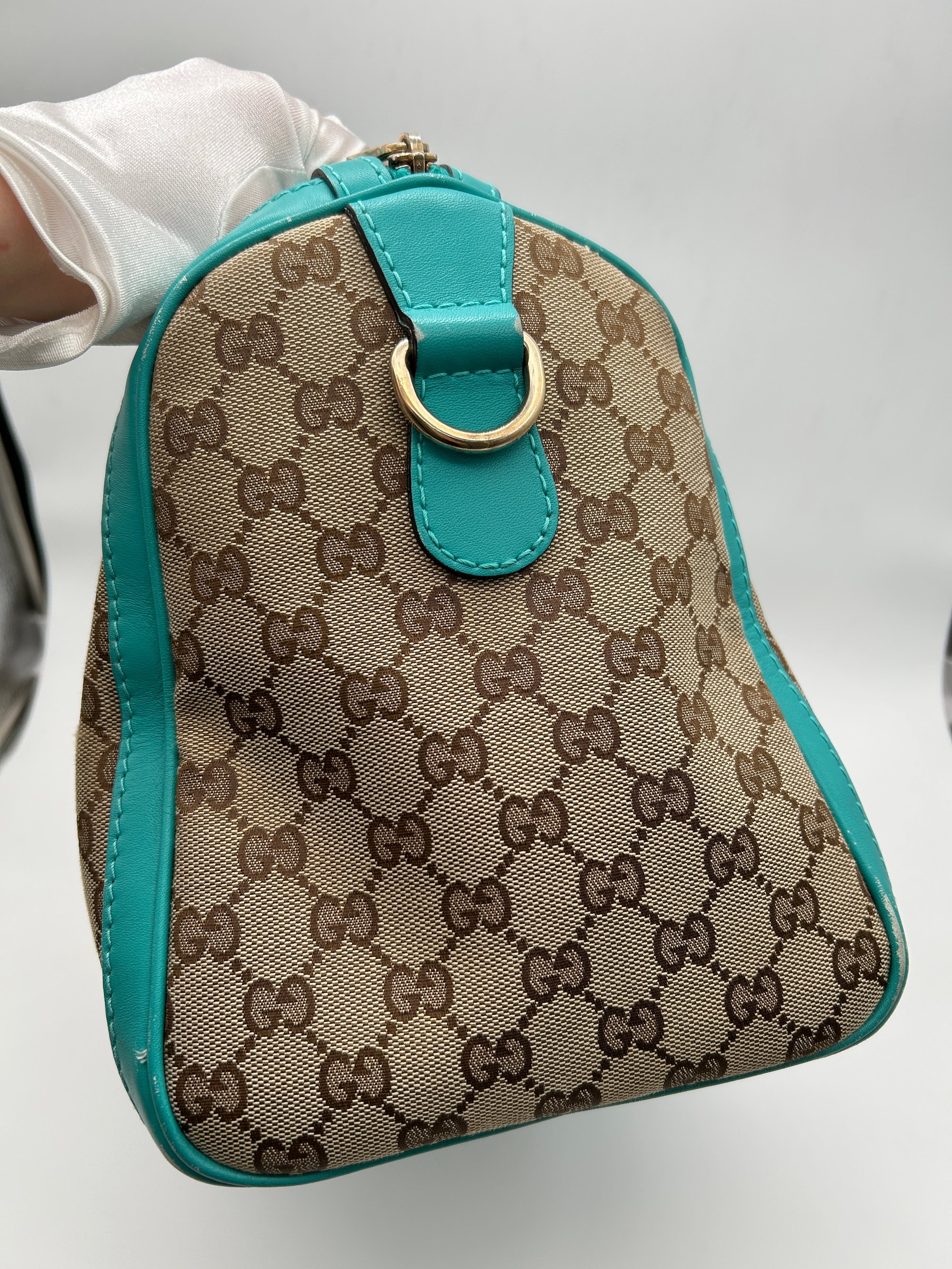 The canvas is free of any tears or holes. The metal hardware has some slight discolouration. All four bottom corners have some scuffing on the leather. The leather handles have a few small scratches. The material on the base of the bag has some water staining. The inside is very clean and has no odour but does have one stain around the opening of the bag.