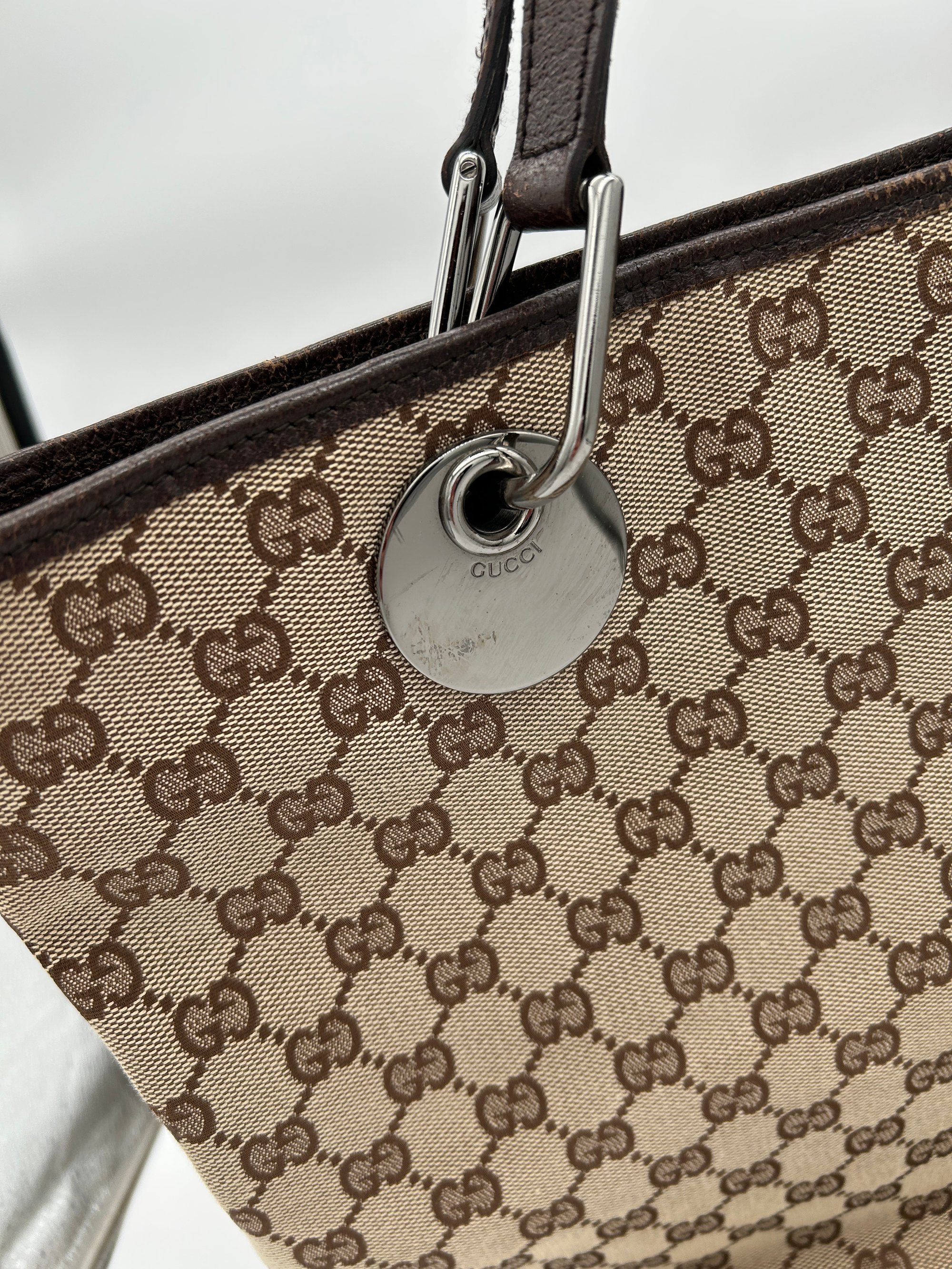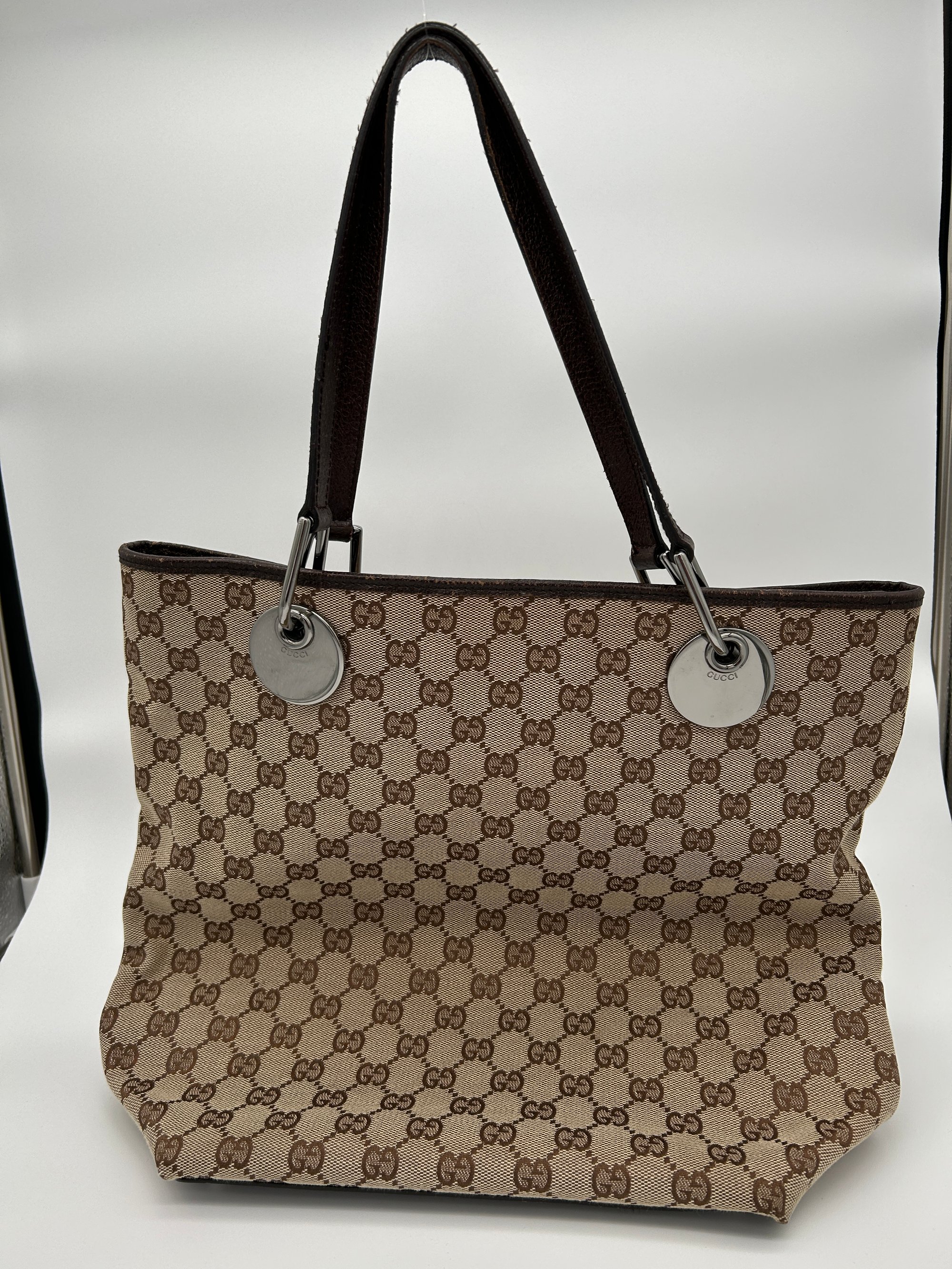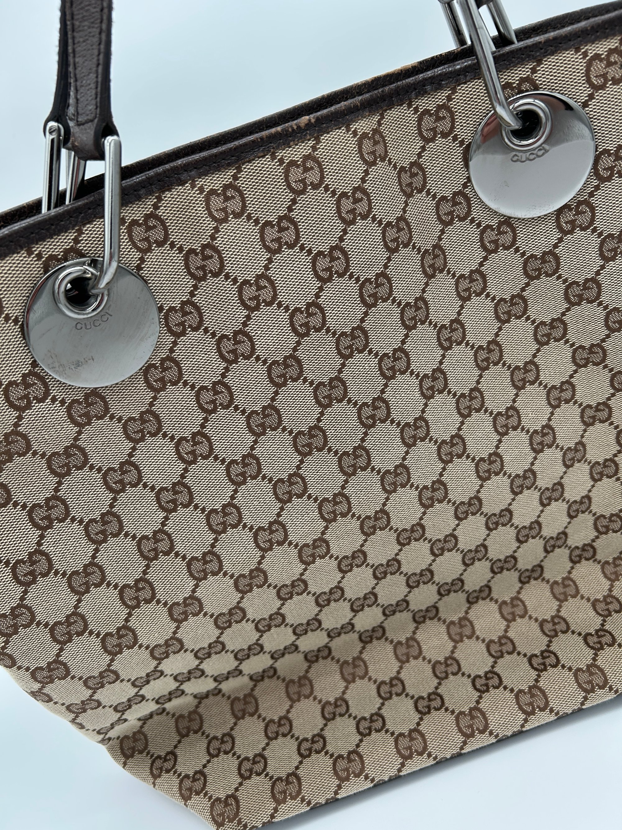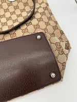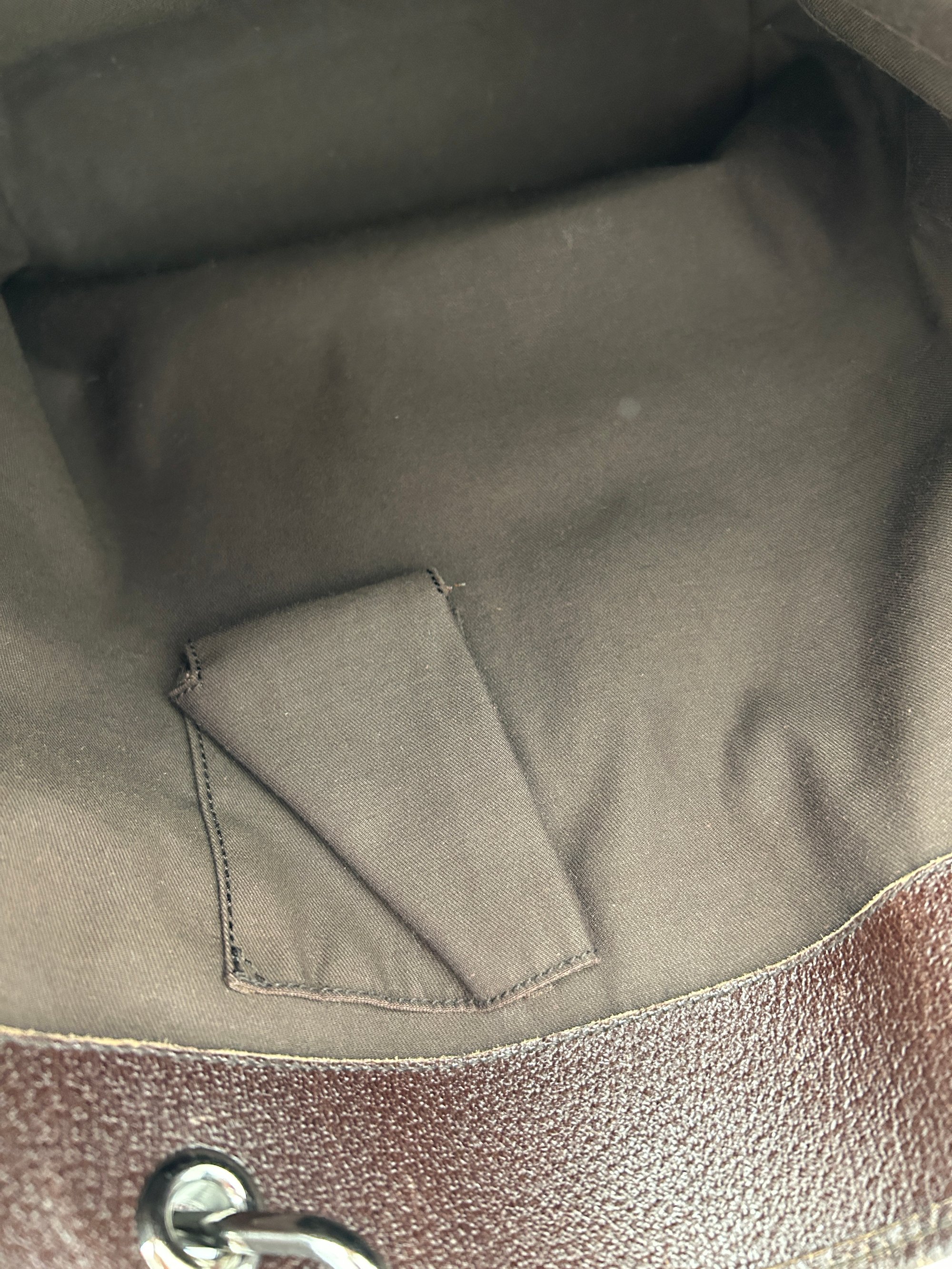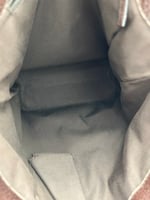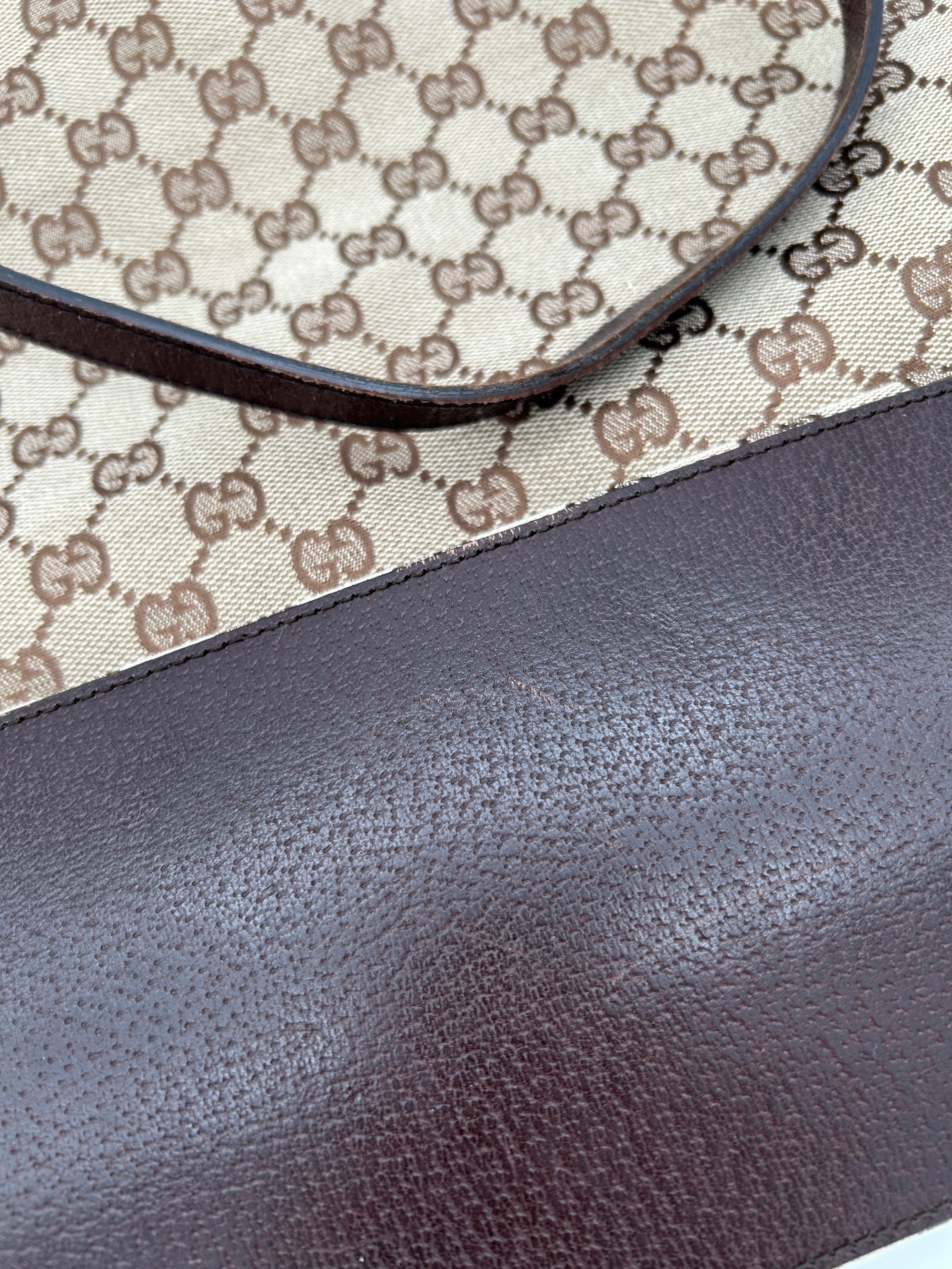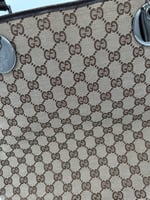 There is some wear on the handles. Some minor wear on all four bottom corners. There is a scratch on the leather at the base of the bag and wear on the leather trimming around the top of the bag. Some scratches on the metal handle connectors. The inside is very clean.