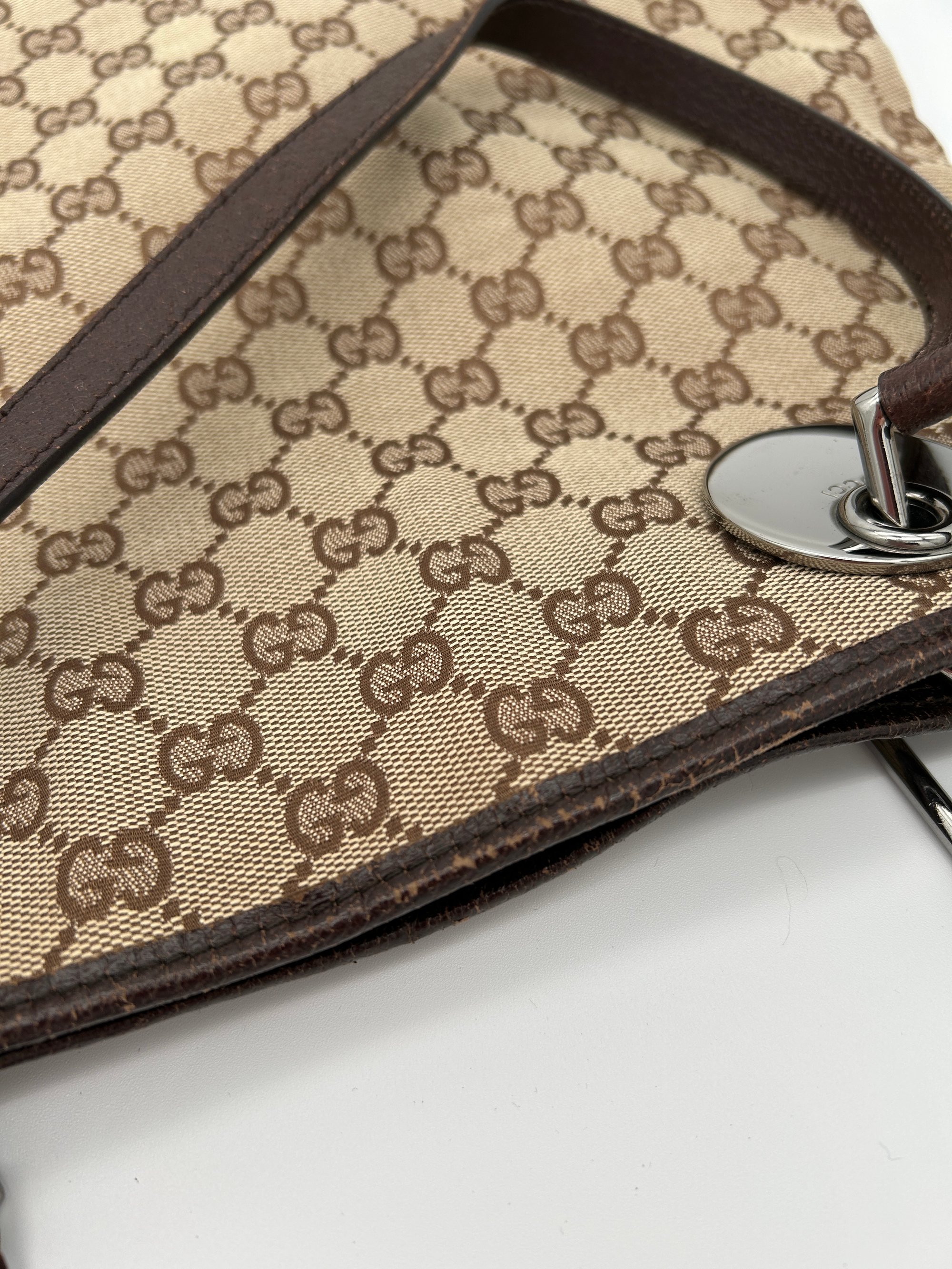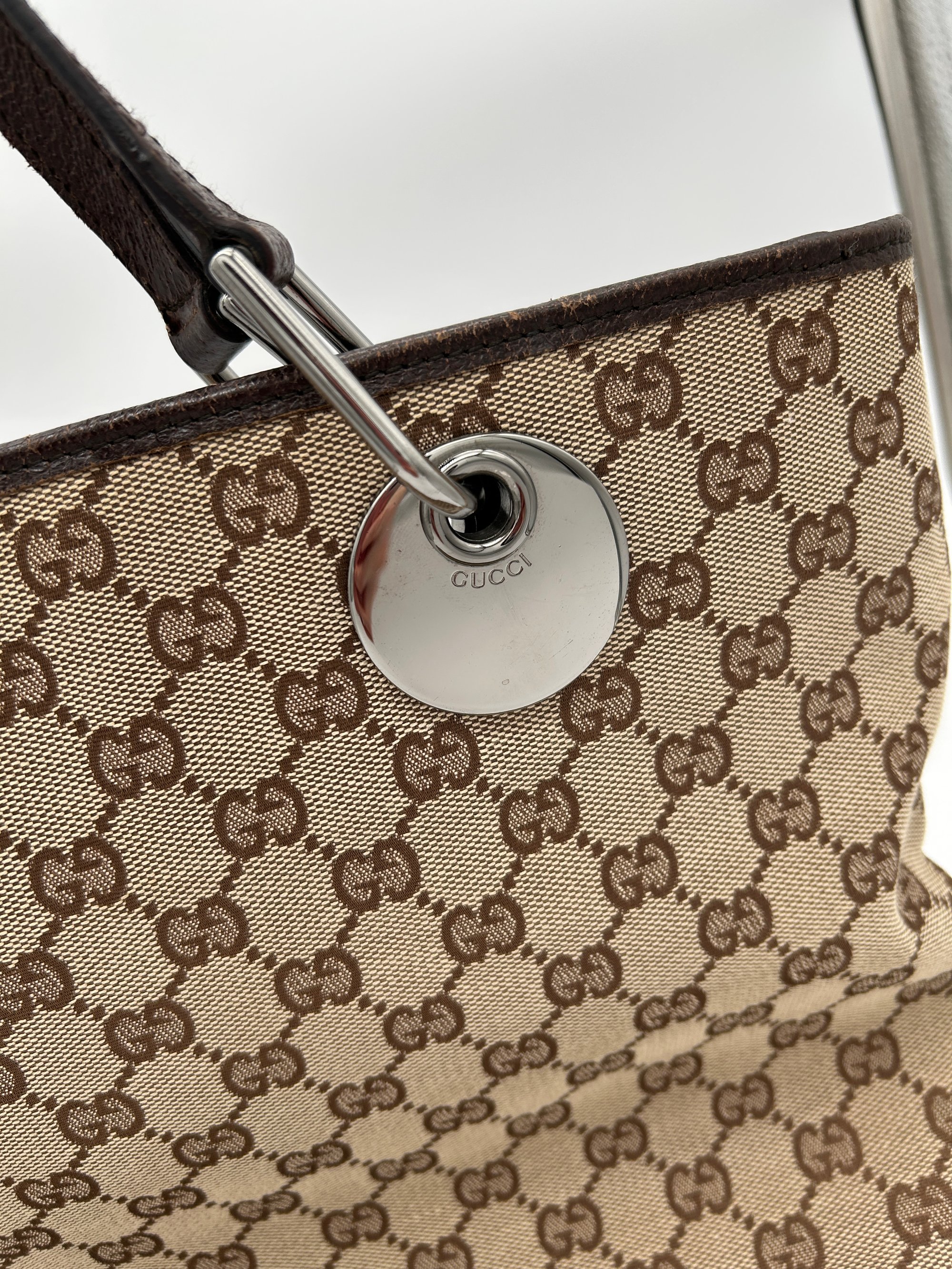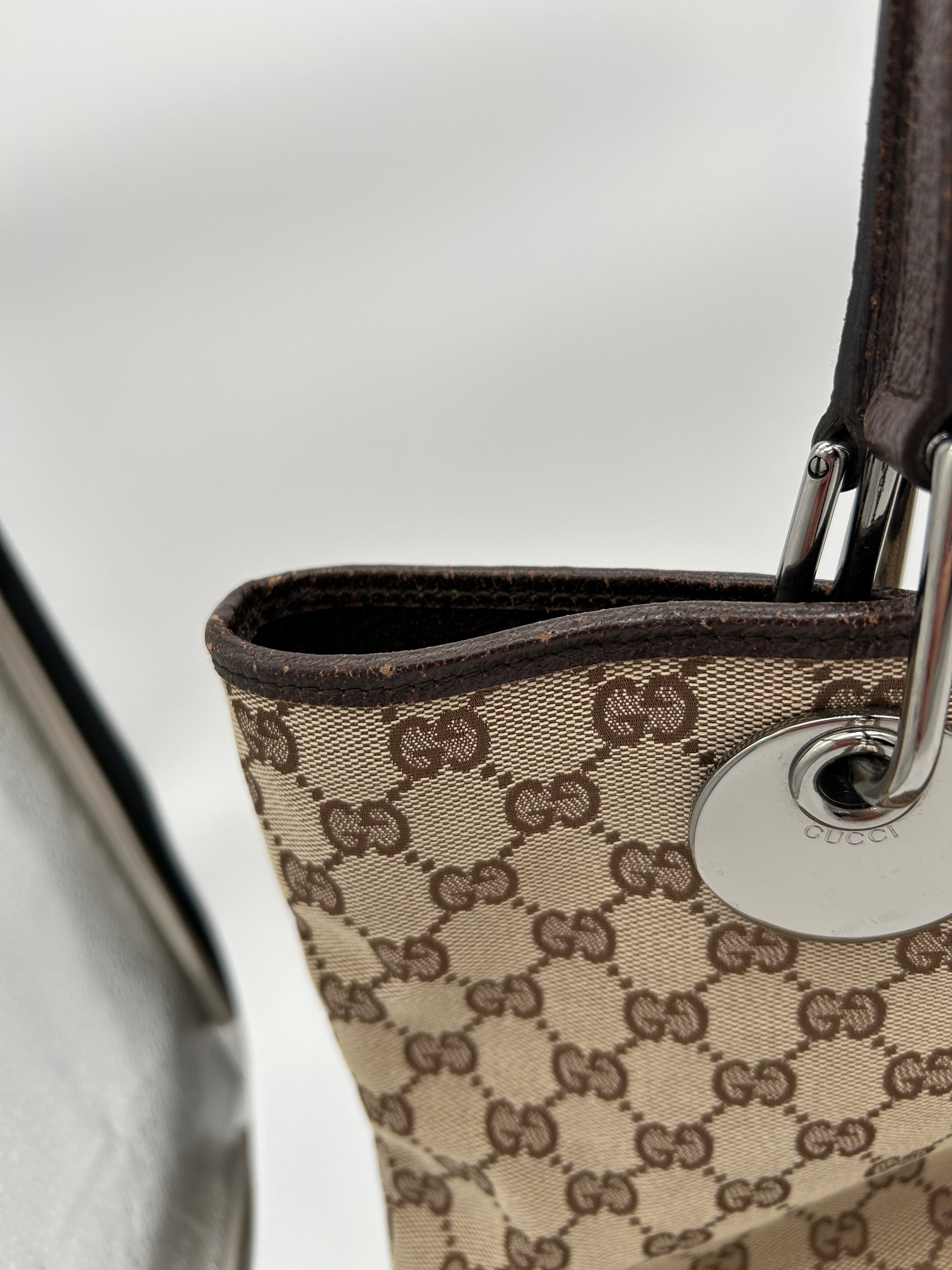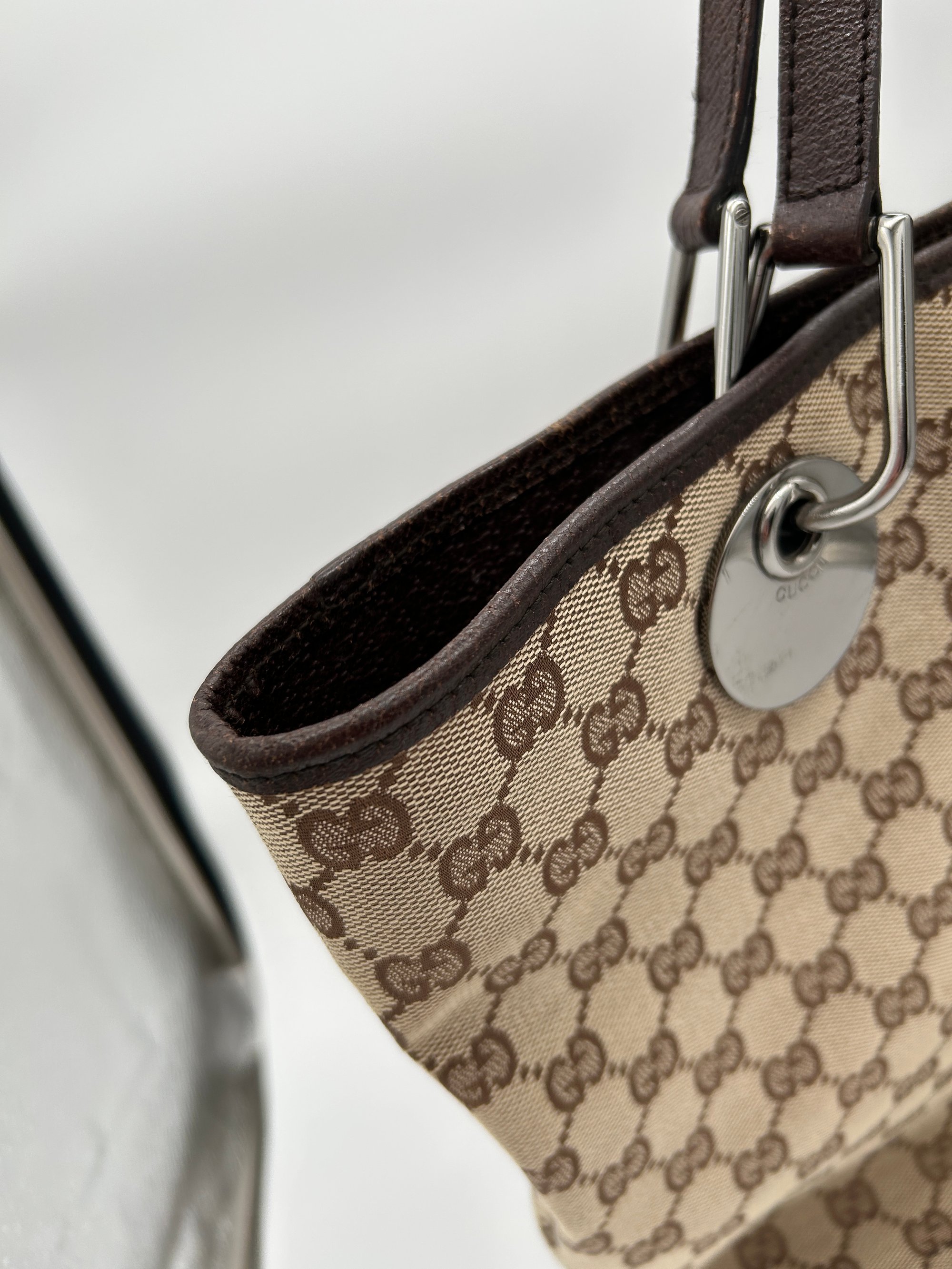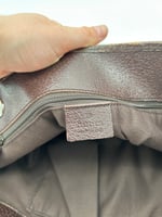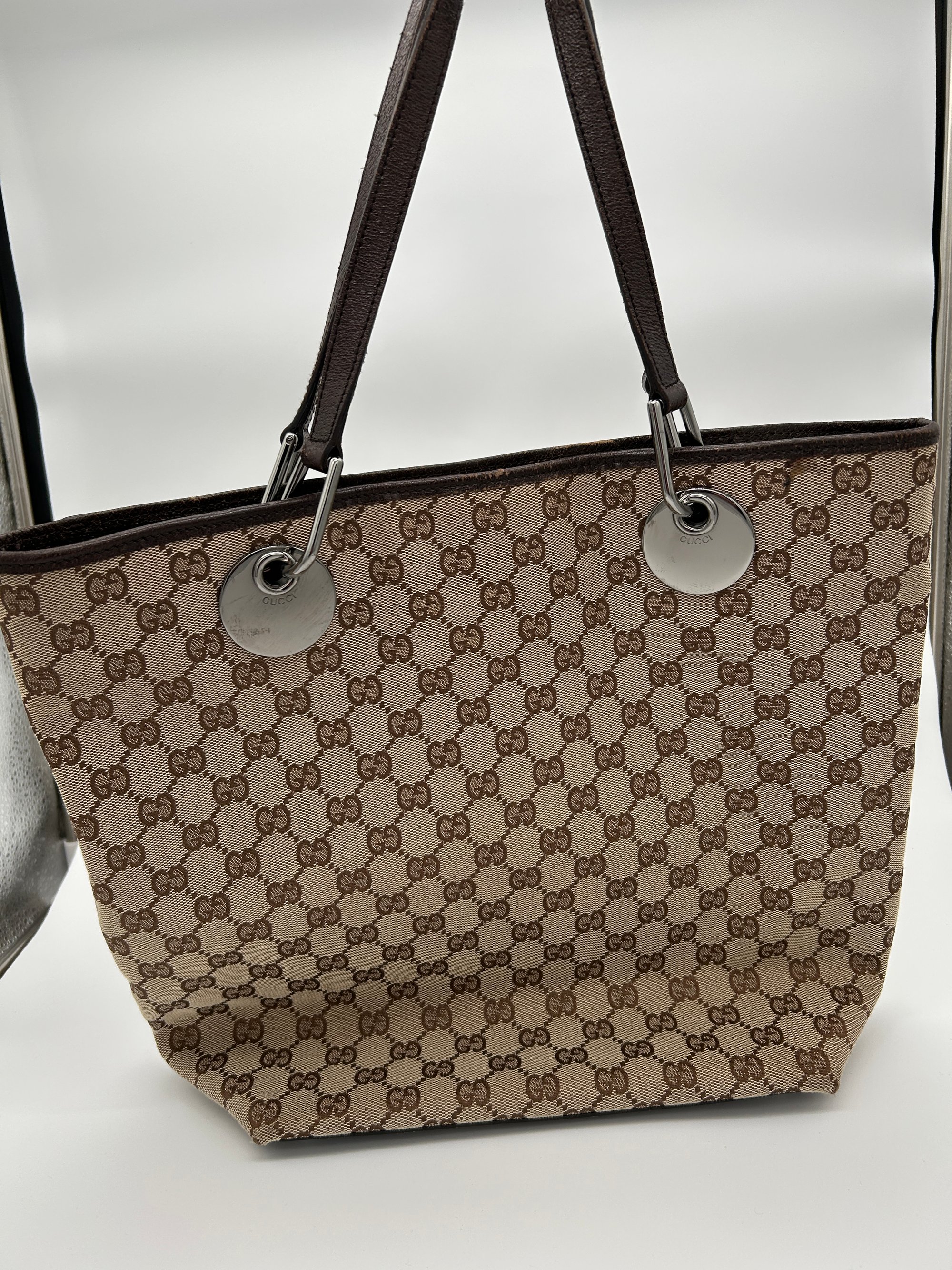 There is some wear on the handles. Some minor wear on all four bottom corners. There is a scratch on the leather at the base of the bag and wear on the leather trimming around the top of the bag. Some scratches on the metal handle connectors. The inside is very clean.
