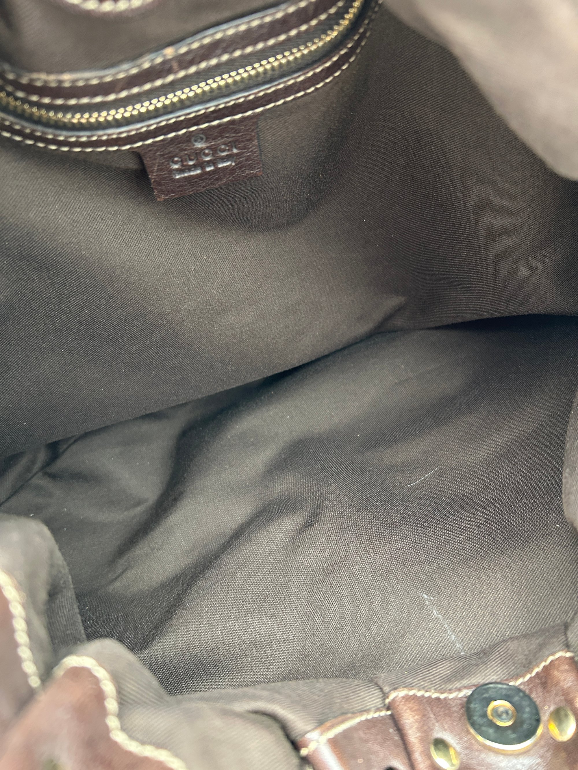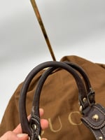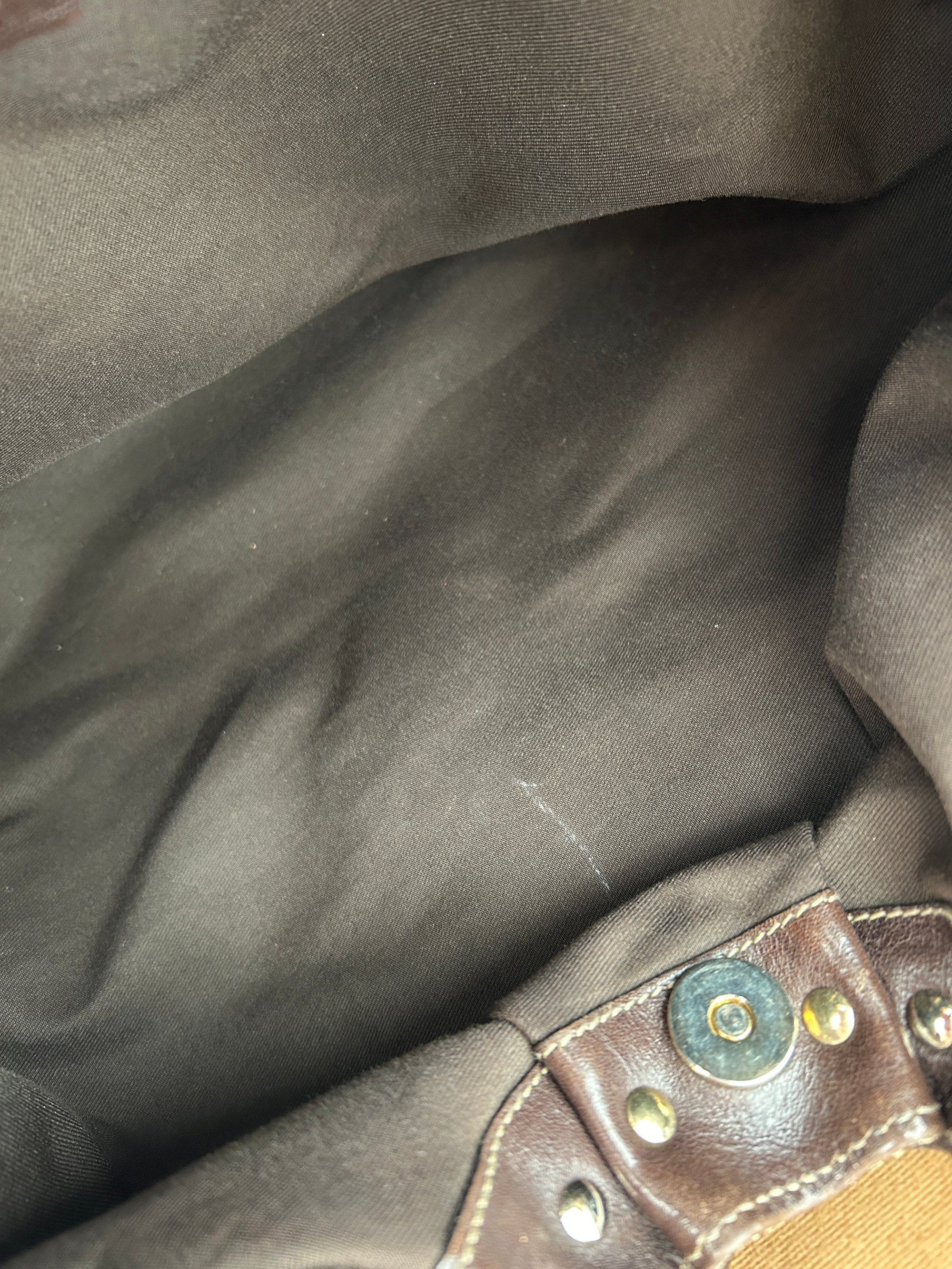 The canvas has a couple of dark marks on one side of the bag. The leather parts have some scratches and signs of wear. The metal hardware has some scratches. The inside has one light mark but has no odour.
