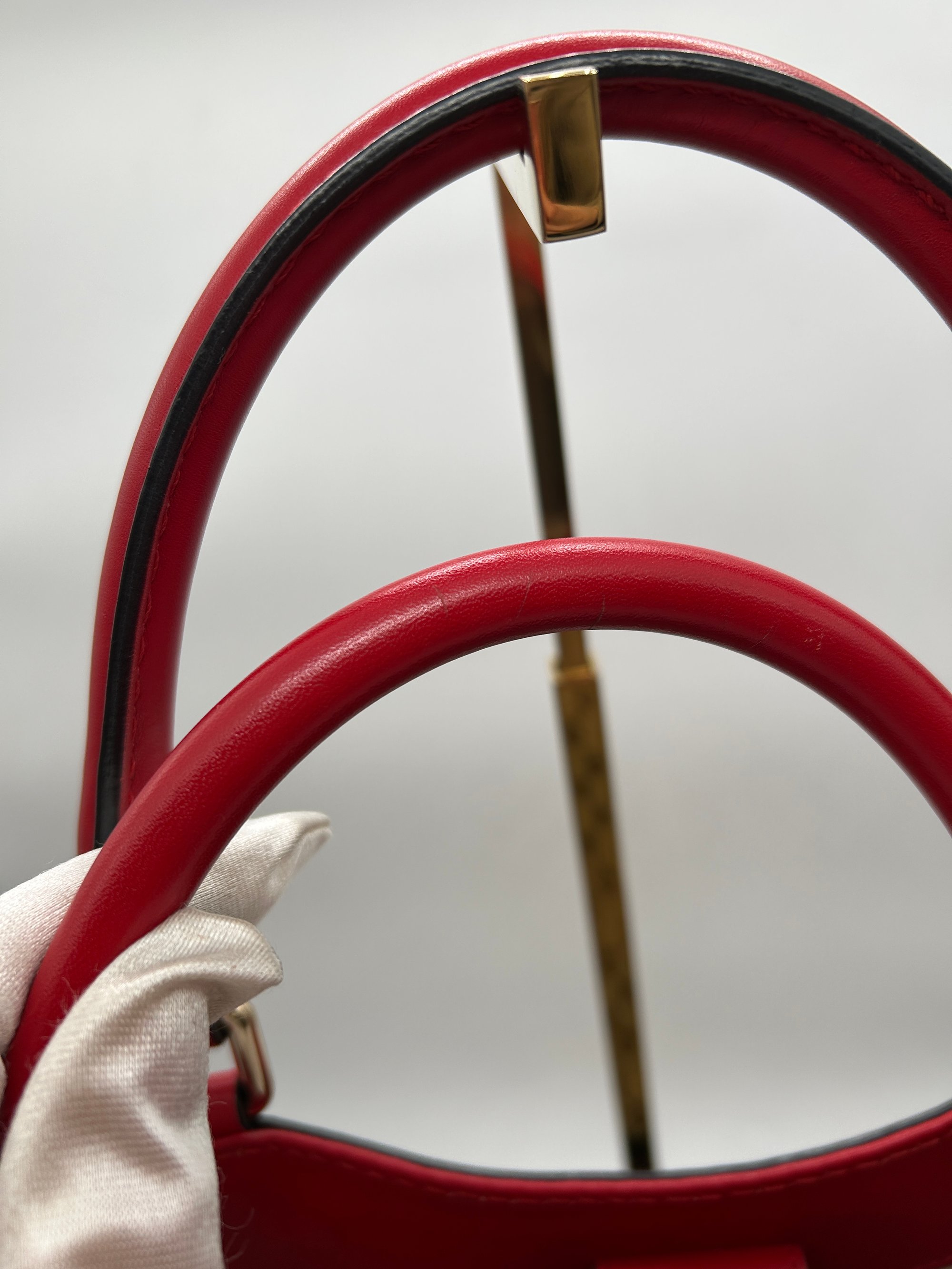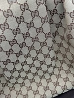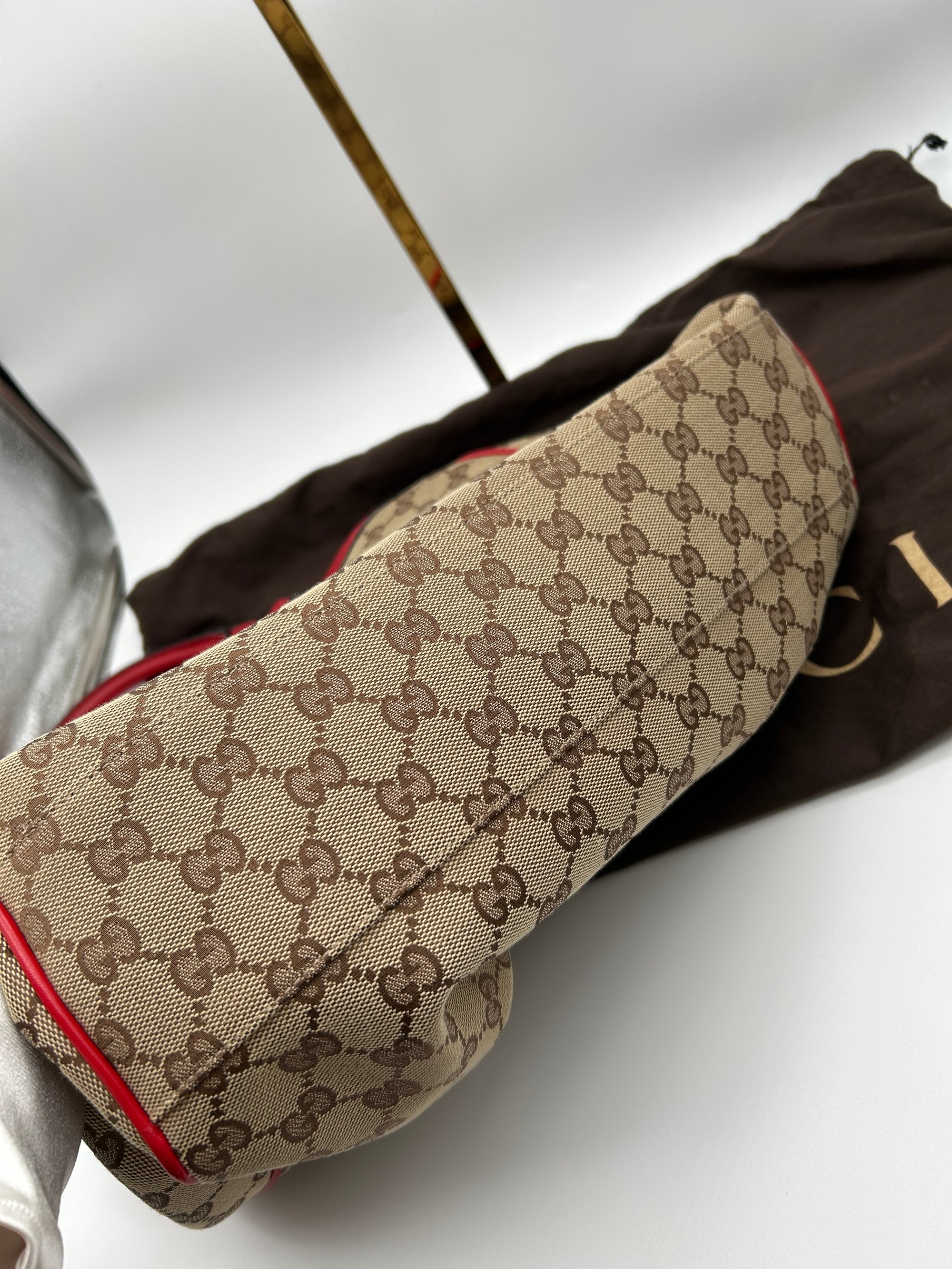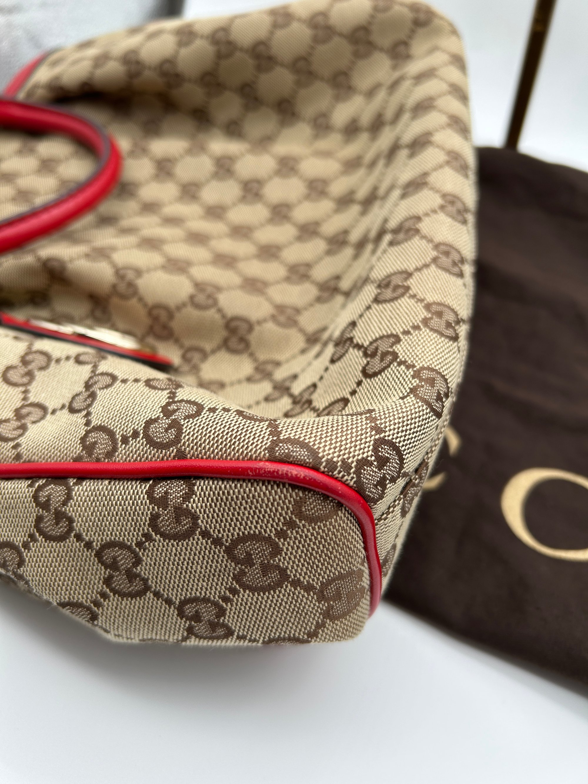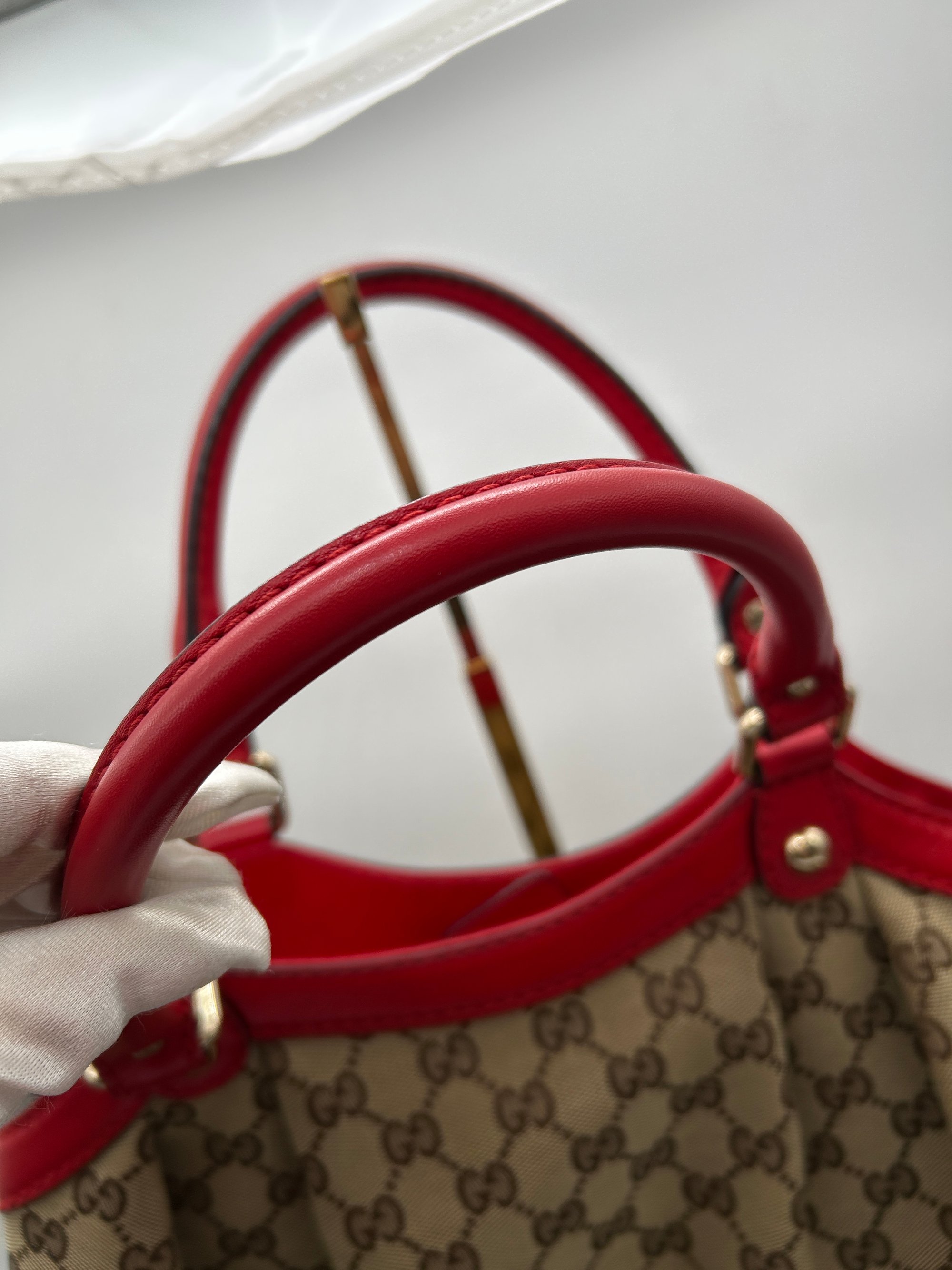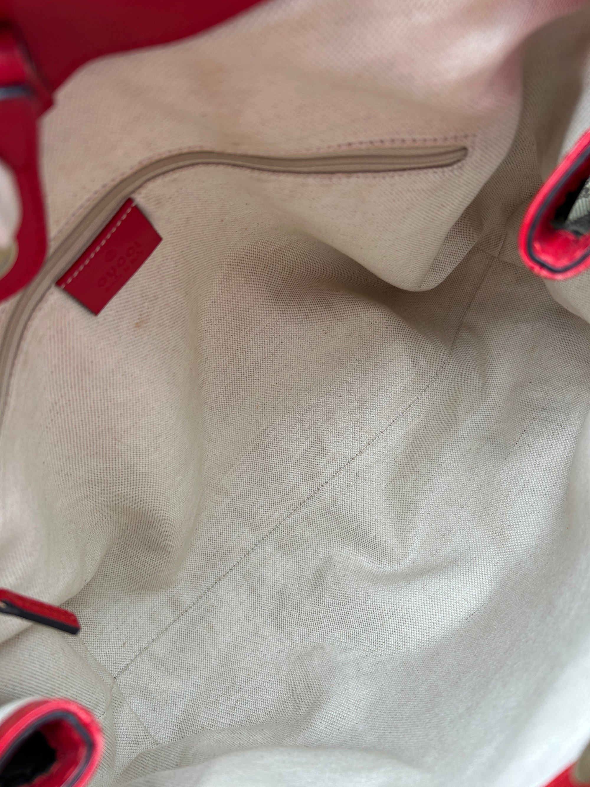 The GG Canvas is free of any tears. The handles have some minor scratches. The piping all on four bottom corners has some scuffing. The inside is pristine & has no odour.