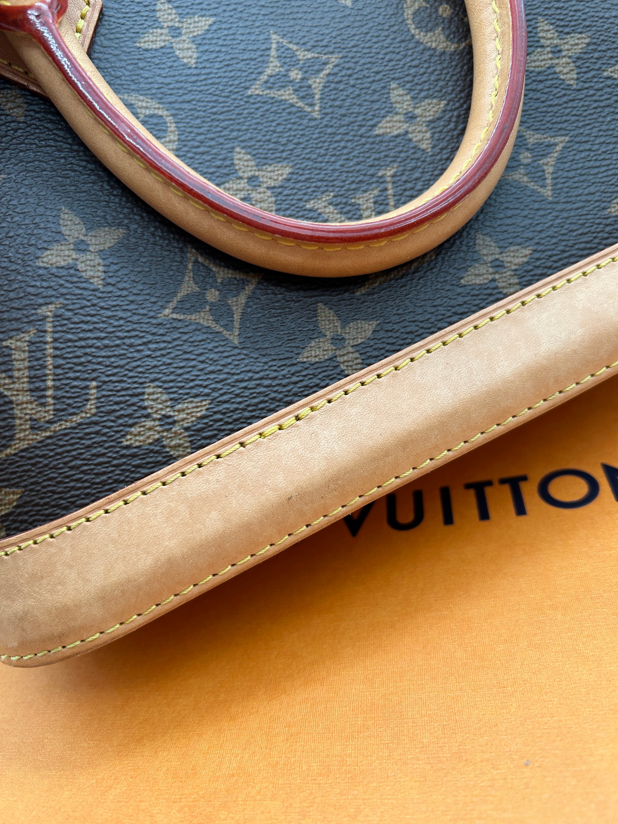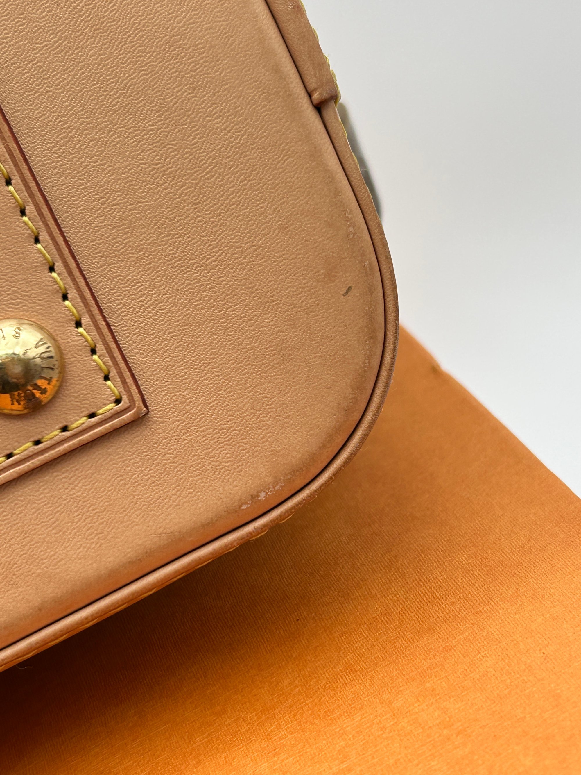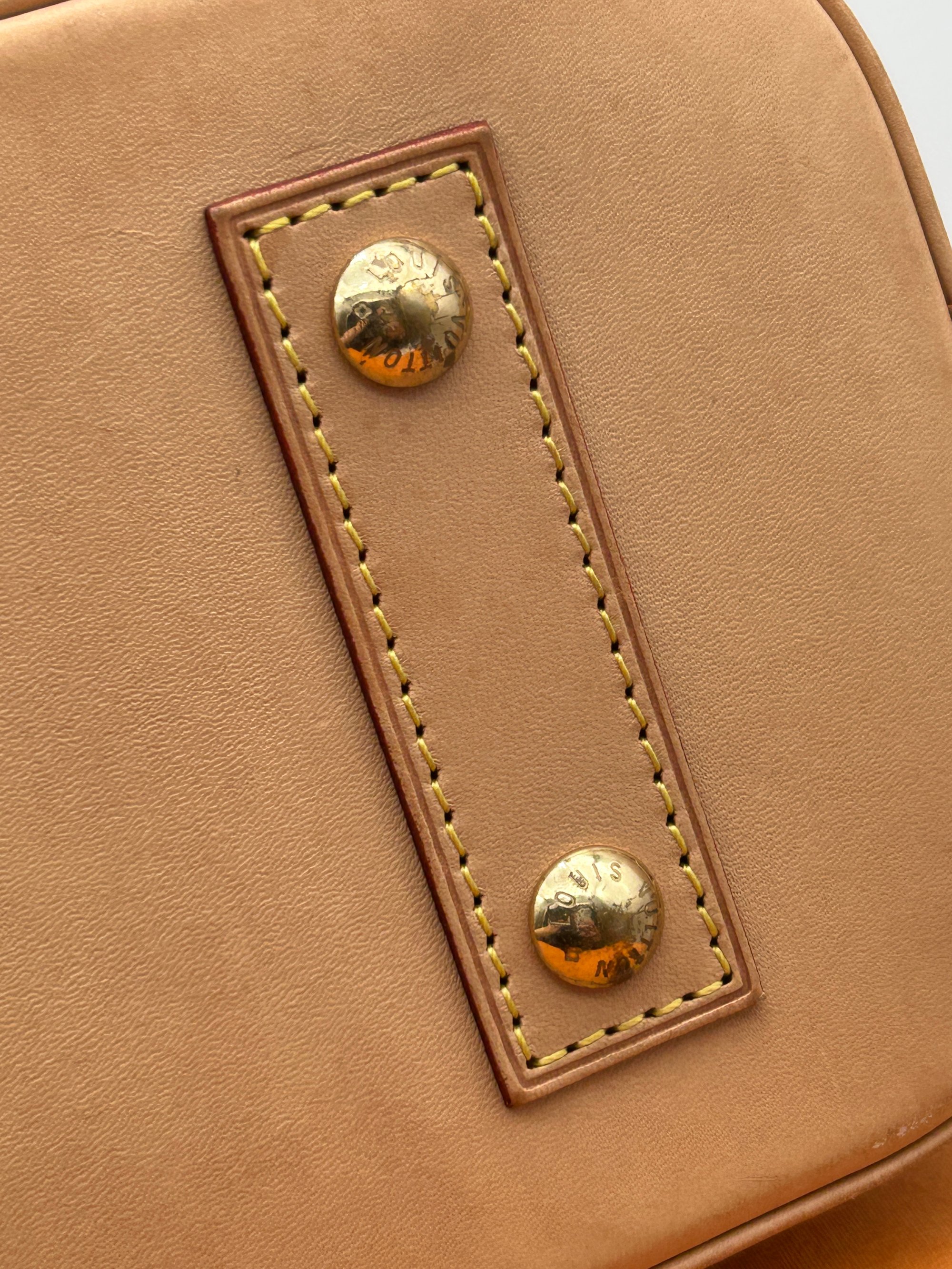 The canvas is free of any or holes or cracks. The Vachetta leather parts have some water marks and rubbing due to wear. Some of the metal hardware has some discolouration. The inside is very clean and has no odour.