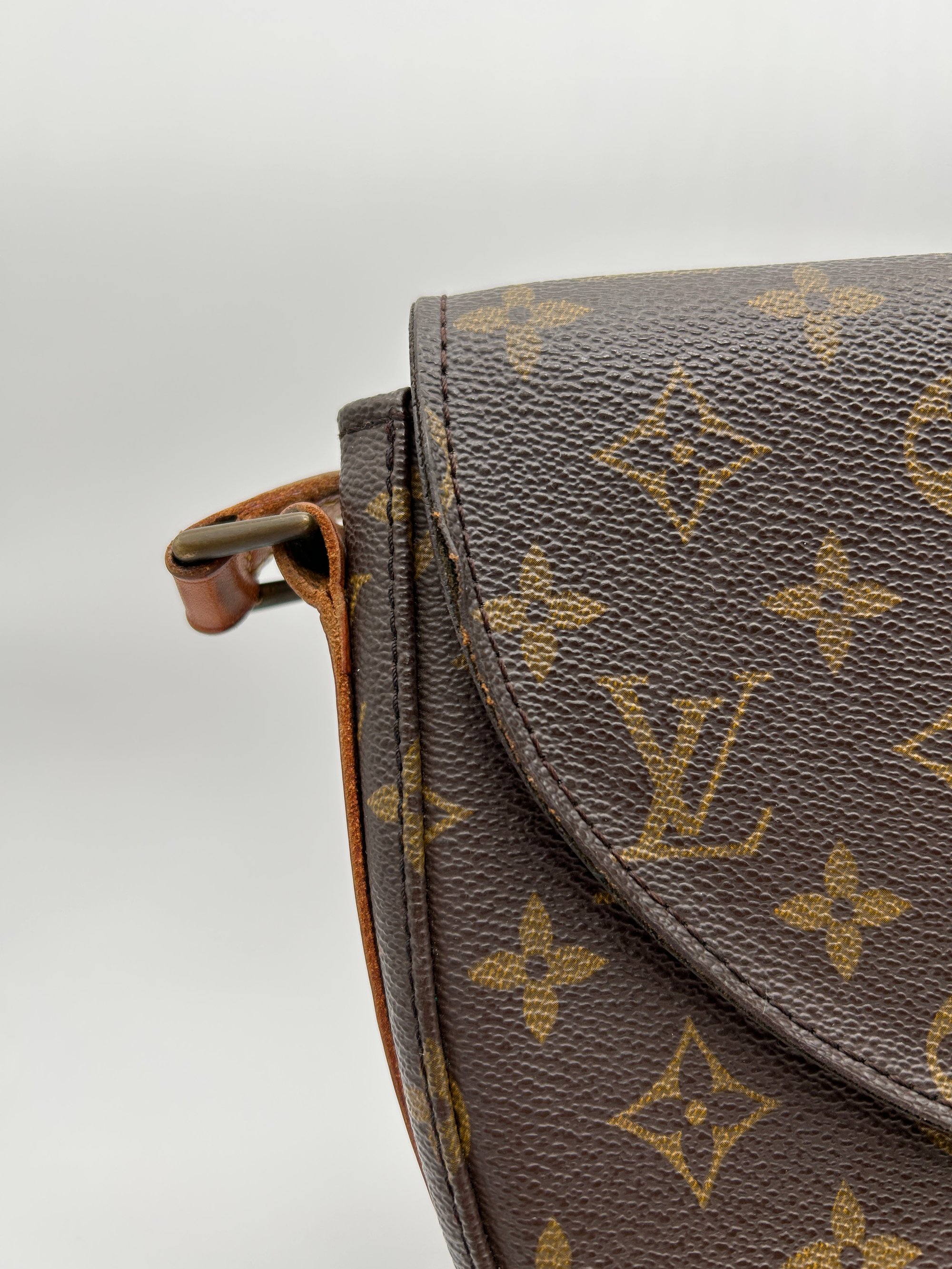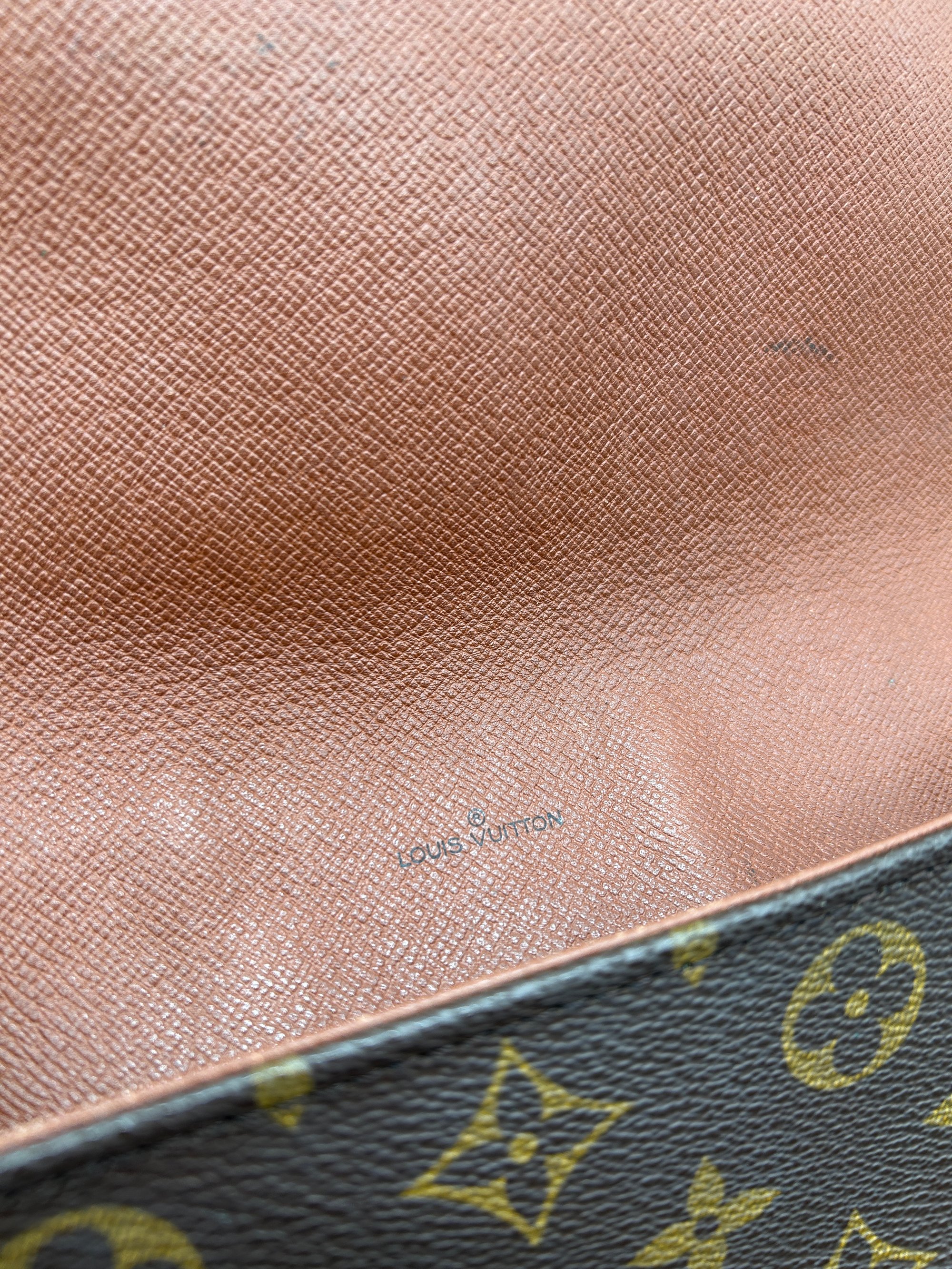 There is some canvas wear on the front corner of the bag (please see photos). The leather strap adjuster has some creasing and discolouration. The metal hardware has some discolouration. The inside is very clean but the interior pocket does have some material wear and the zipper is stiff to open/close.