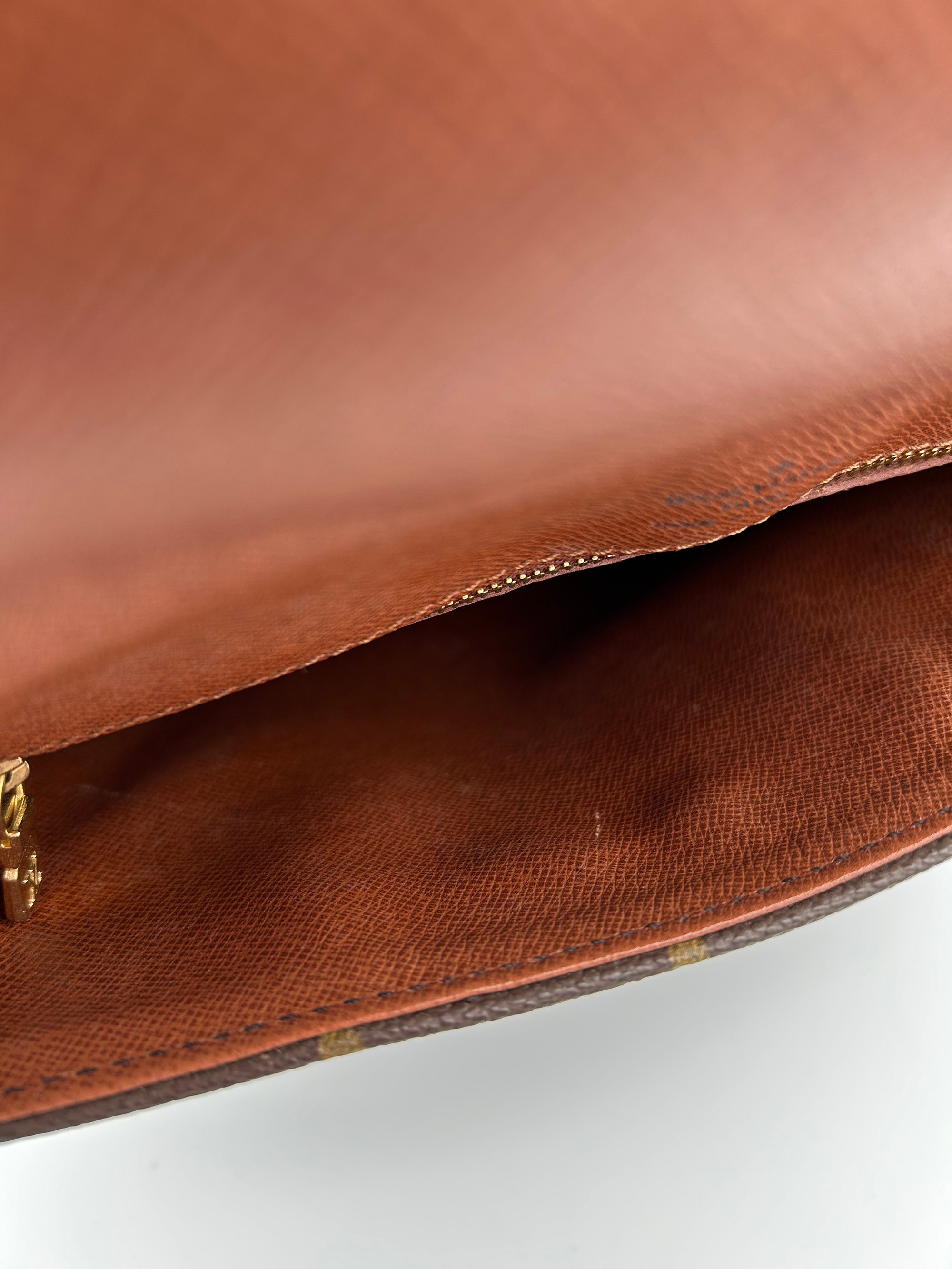 The Monogram Canvas is free of any cracks of tears. There are some water marks on leather parts. The inside is very clean with one white mark and the inside pouch has some material wear due to age.