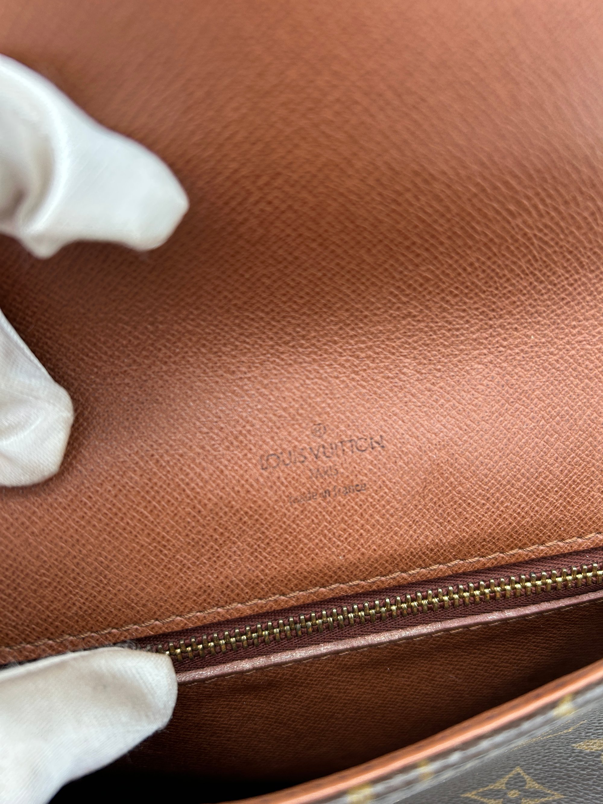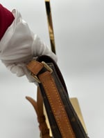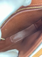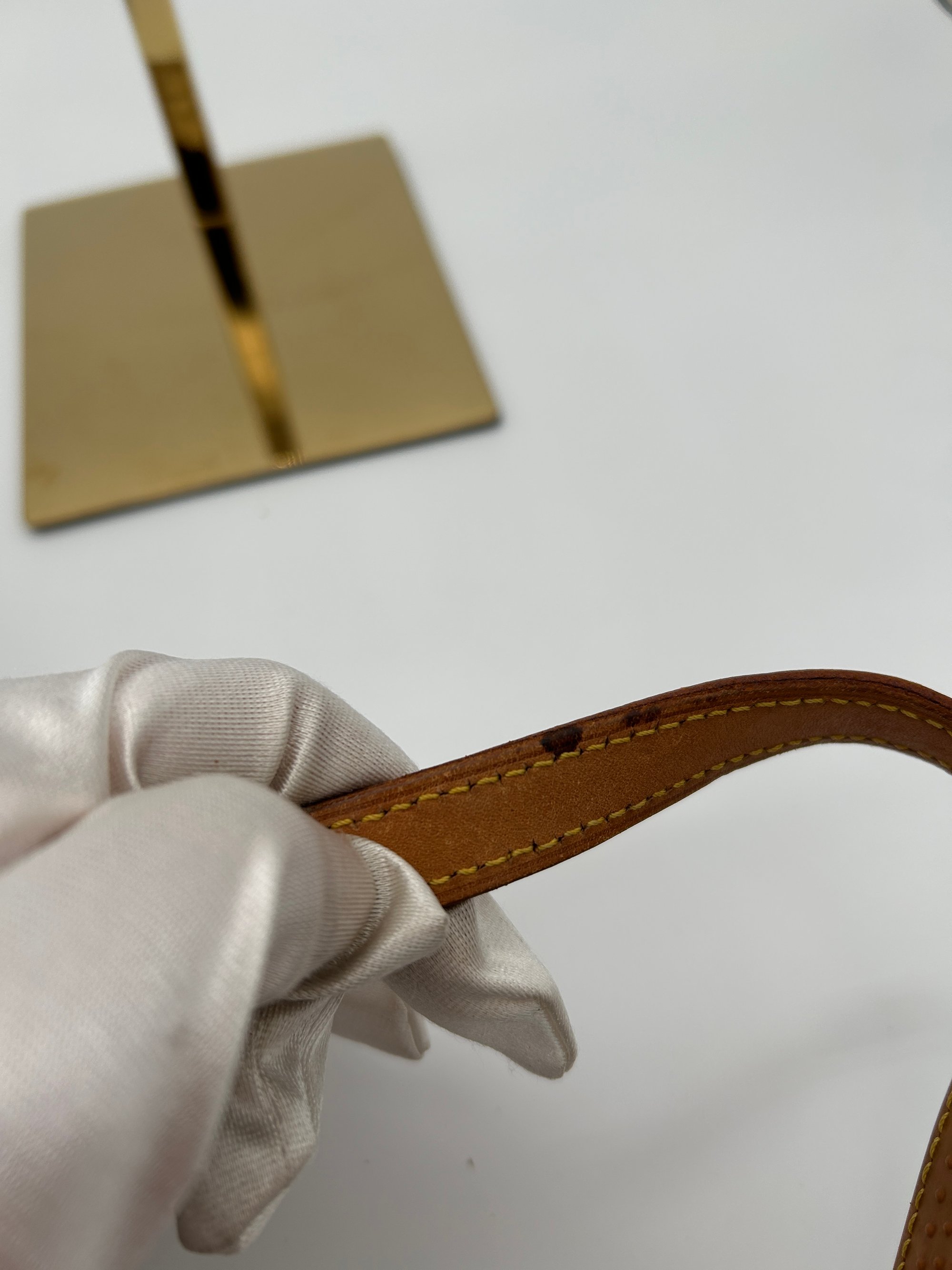 There is some very minor canvas fade on the front opening and some material wear around the edge of the bag opening. The Vachetta leather has some scratches and darkening. The metal hardware has clear signs of discolouration. The inside of the bag is very clean.