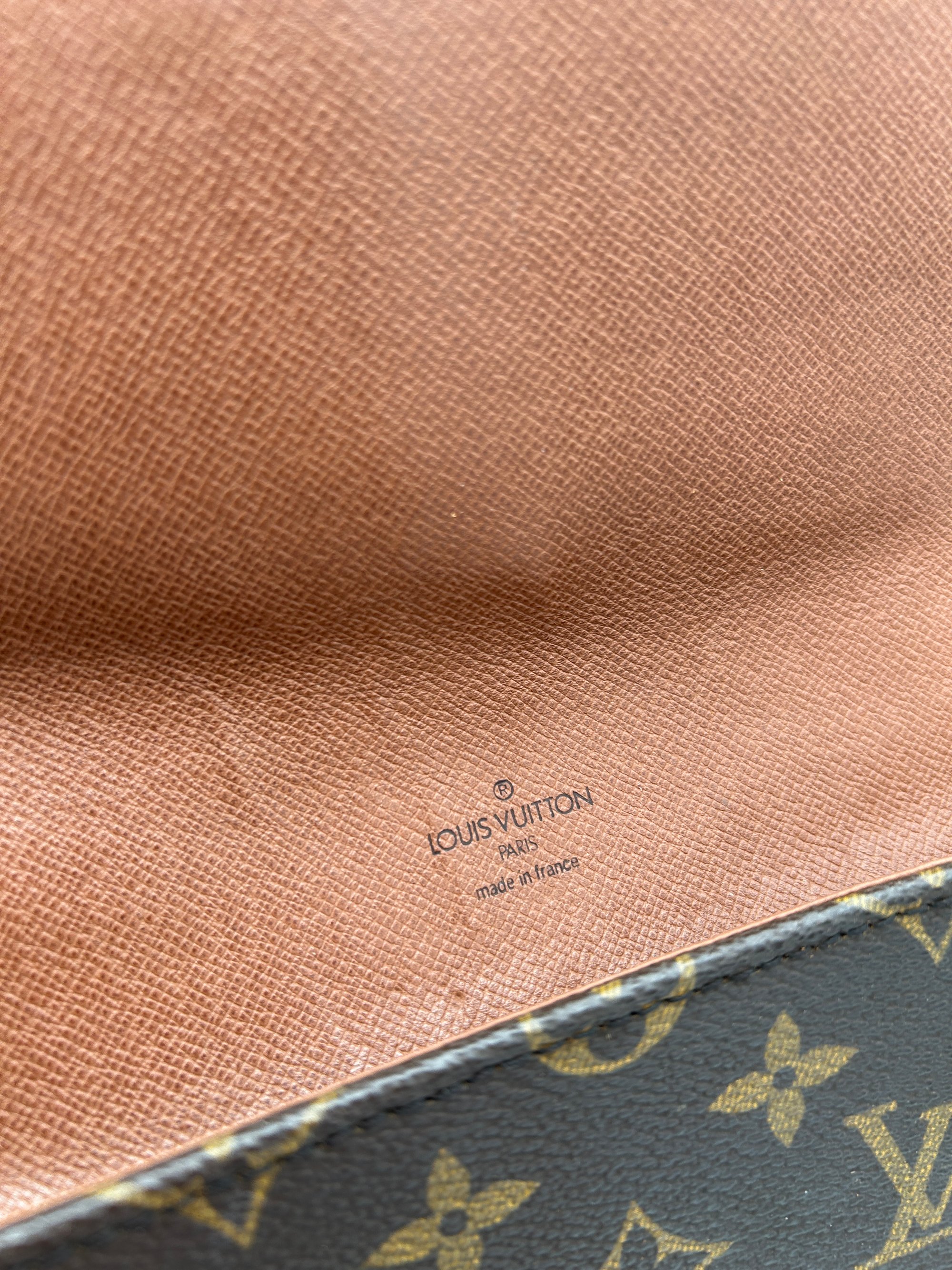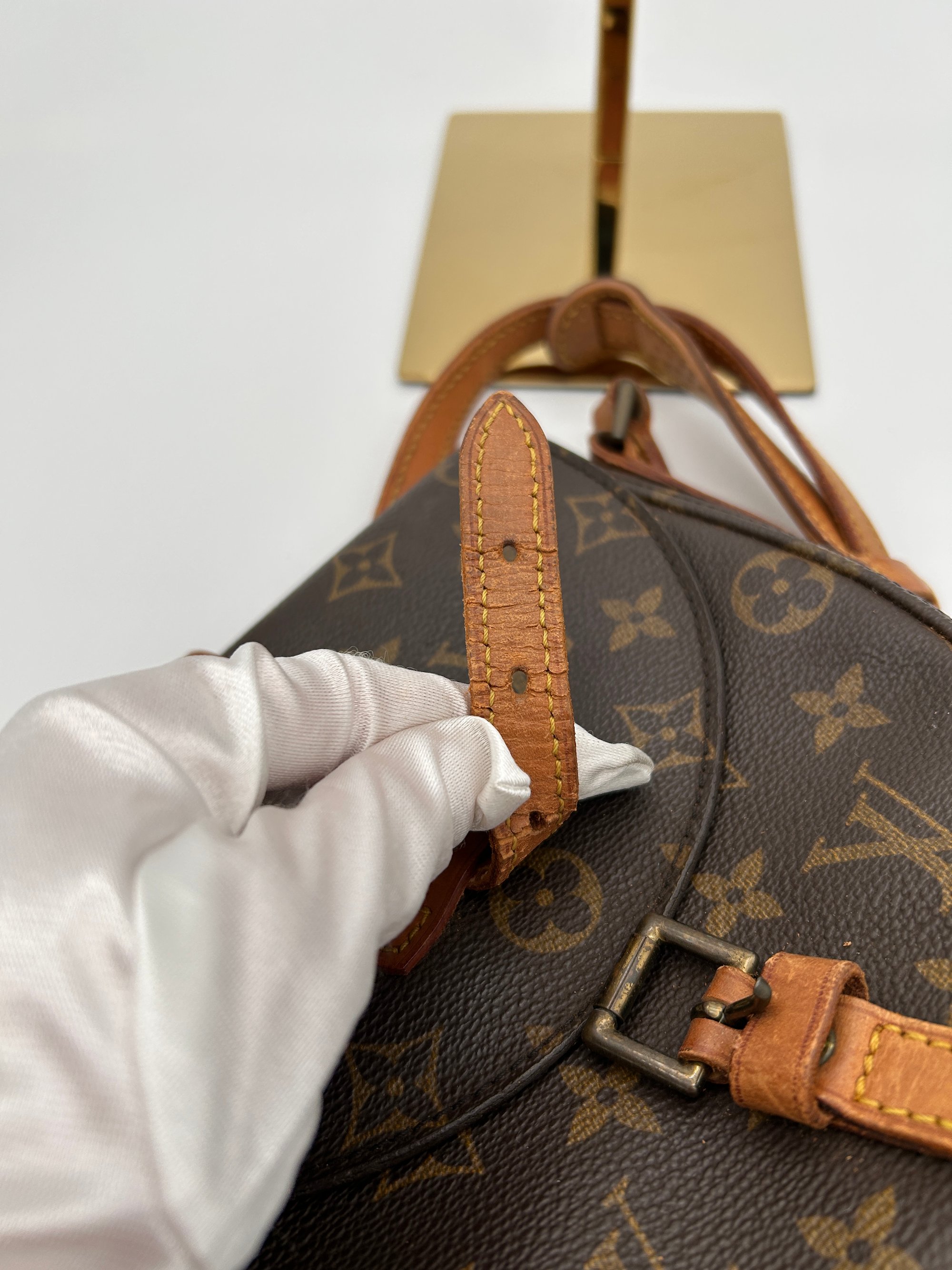 The leather opening has some cracking on the leather. The leather parts have some water marks and discolouration. The metal hardware has discoloured due to its age. The canvas is free of any cracks or tears. The inside of the bag is very clean. The inside pocket has some stickiness.