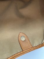 The leather parts have some rubbing and slight discolouration. The leather strap has some creasing due to wear. The canvas has no cracks or tears. The metal hardware has some discolouration and scratches. The inside is very clean and has no odour.