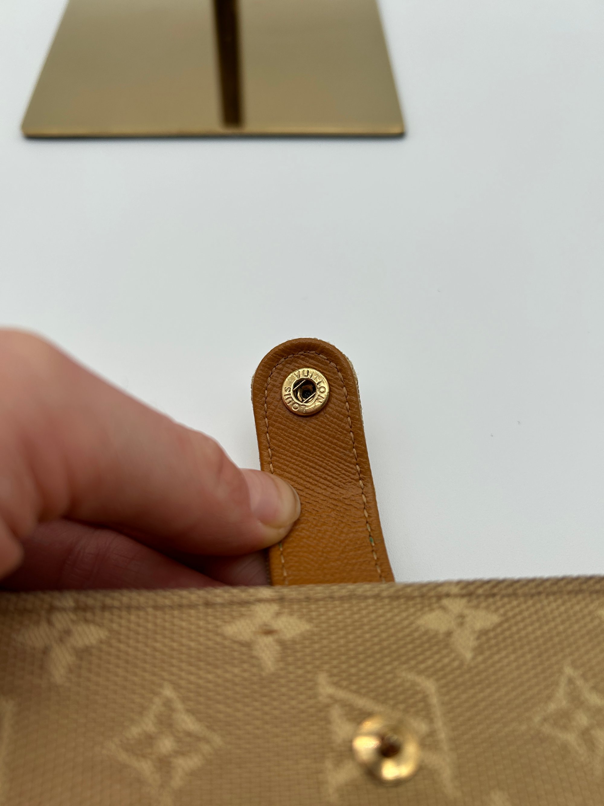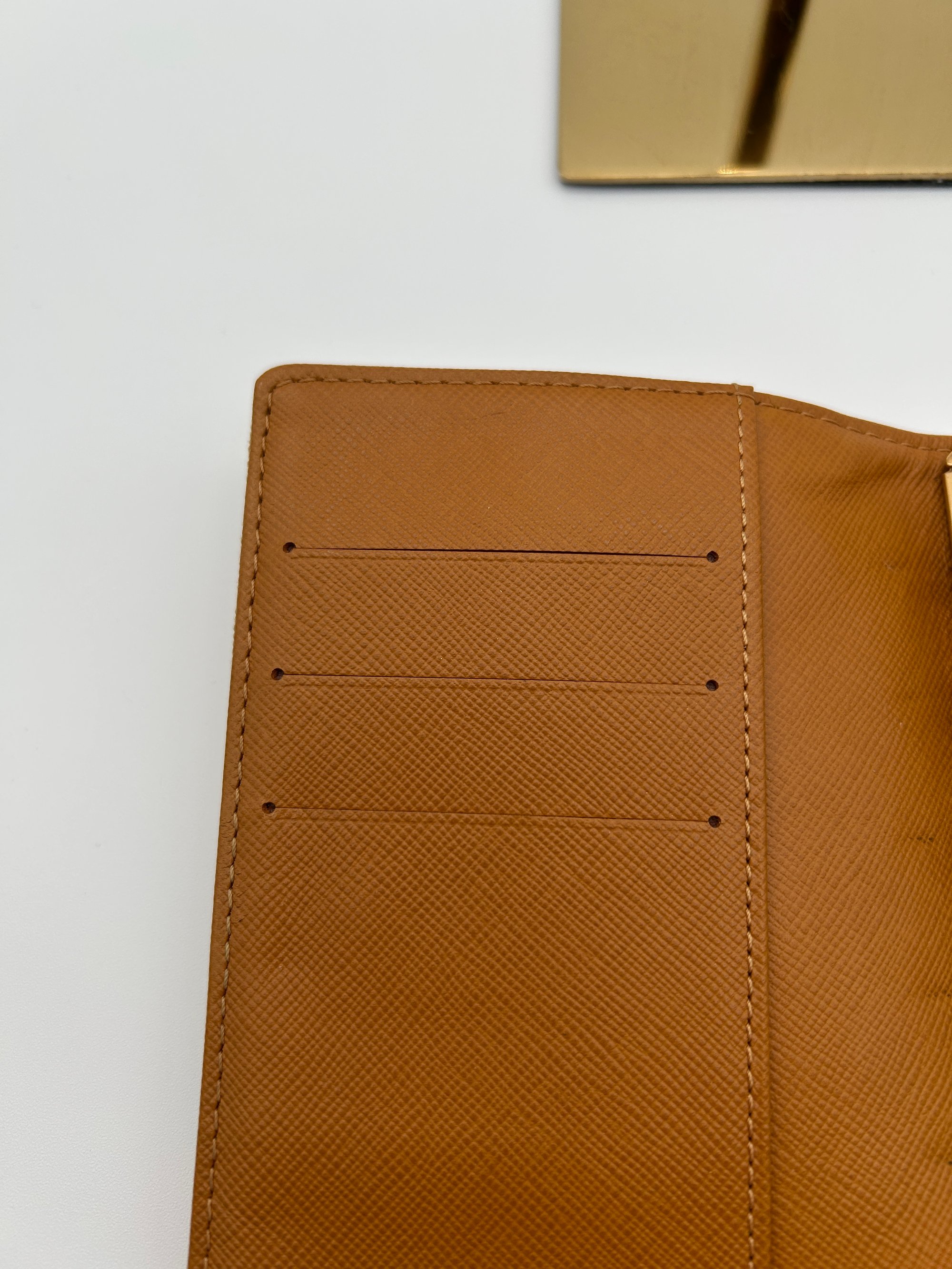 There is some slight discolouration on the corners and on the outside of the opening tab. The inside is pristine. There are 3 card slots inside.
