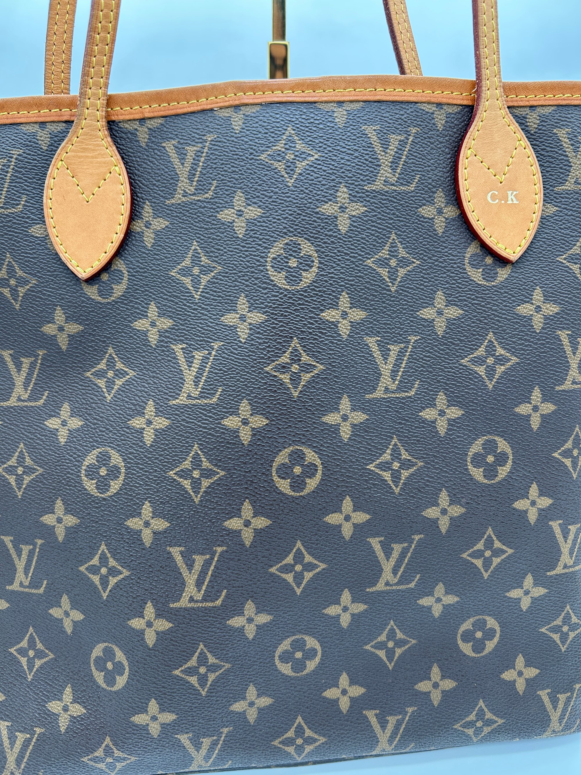 The leather has some darkening and rubbing. The canvas is free of any cracks or tears. The inside has some very minor staining and has no odour. One handle is hot stamped with the initials C.K