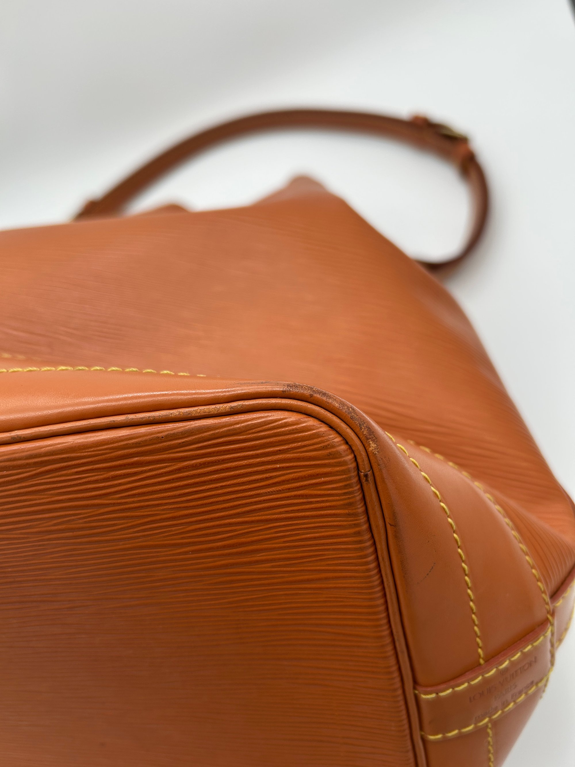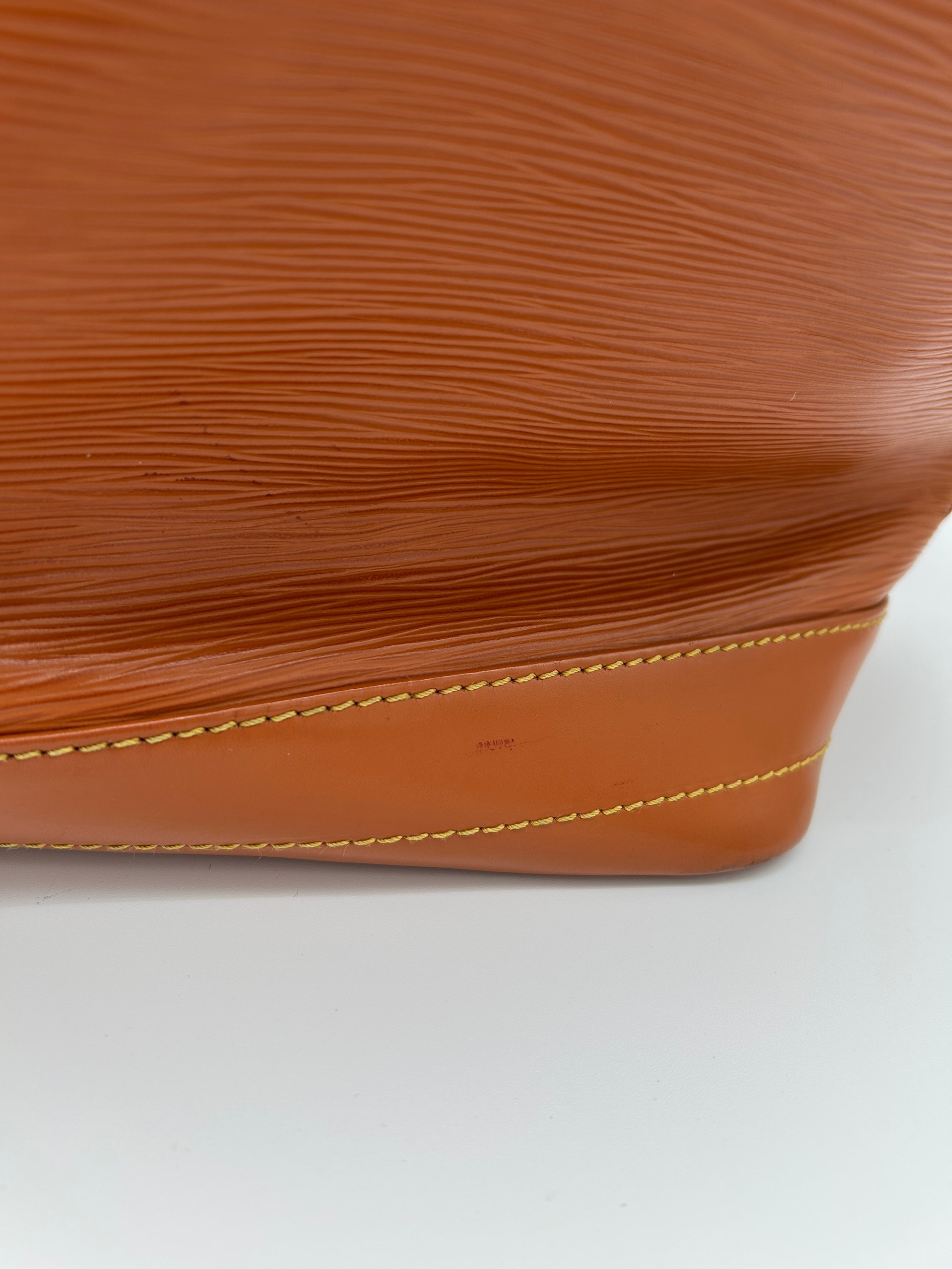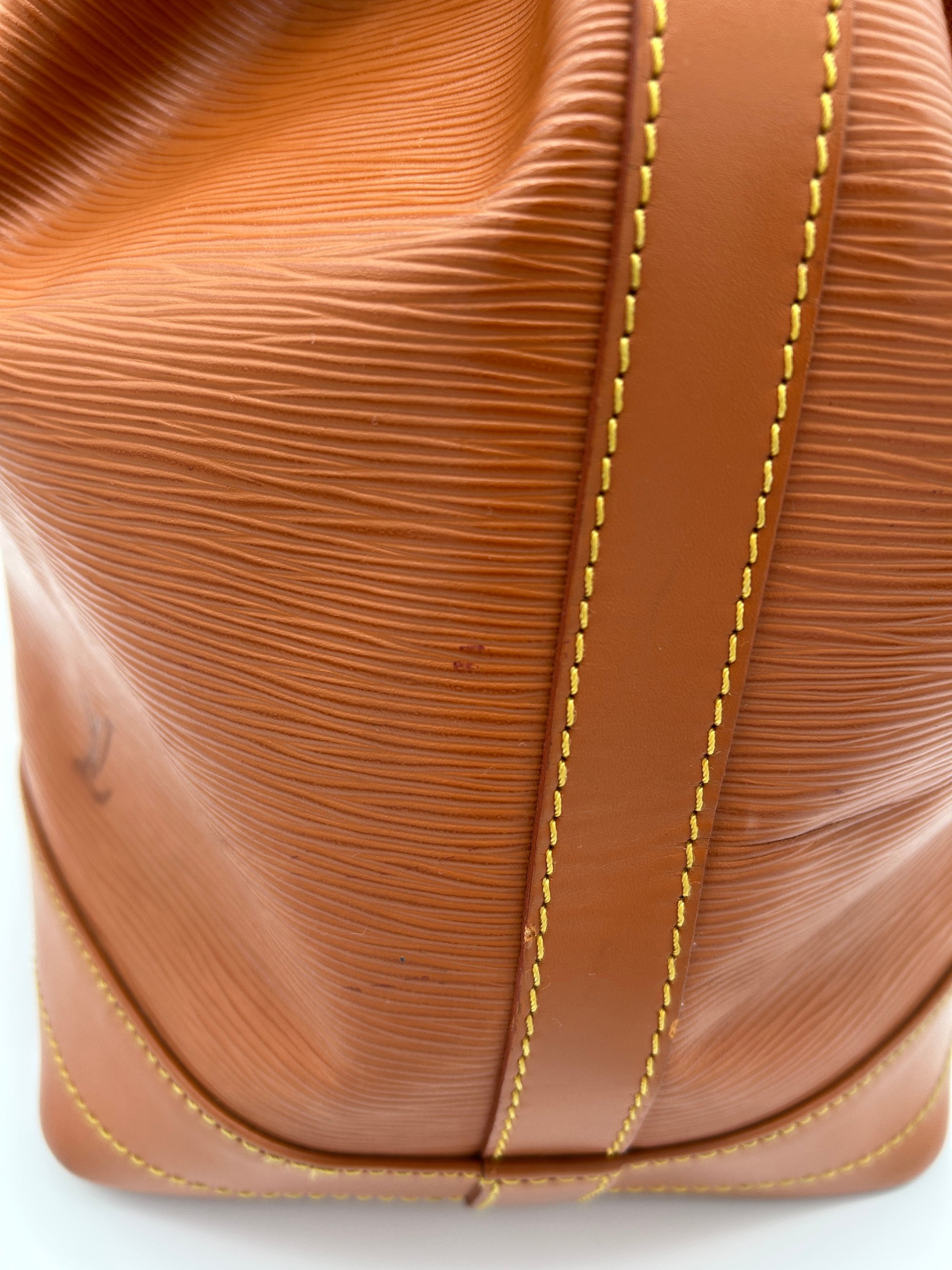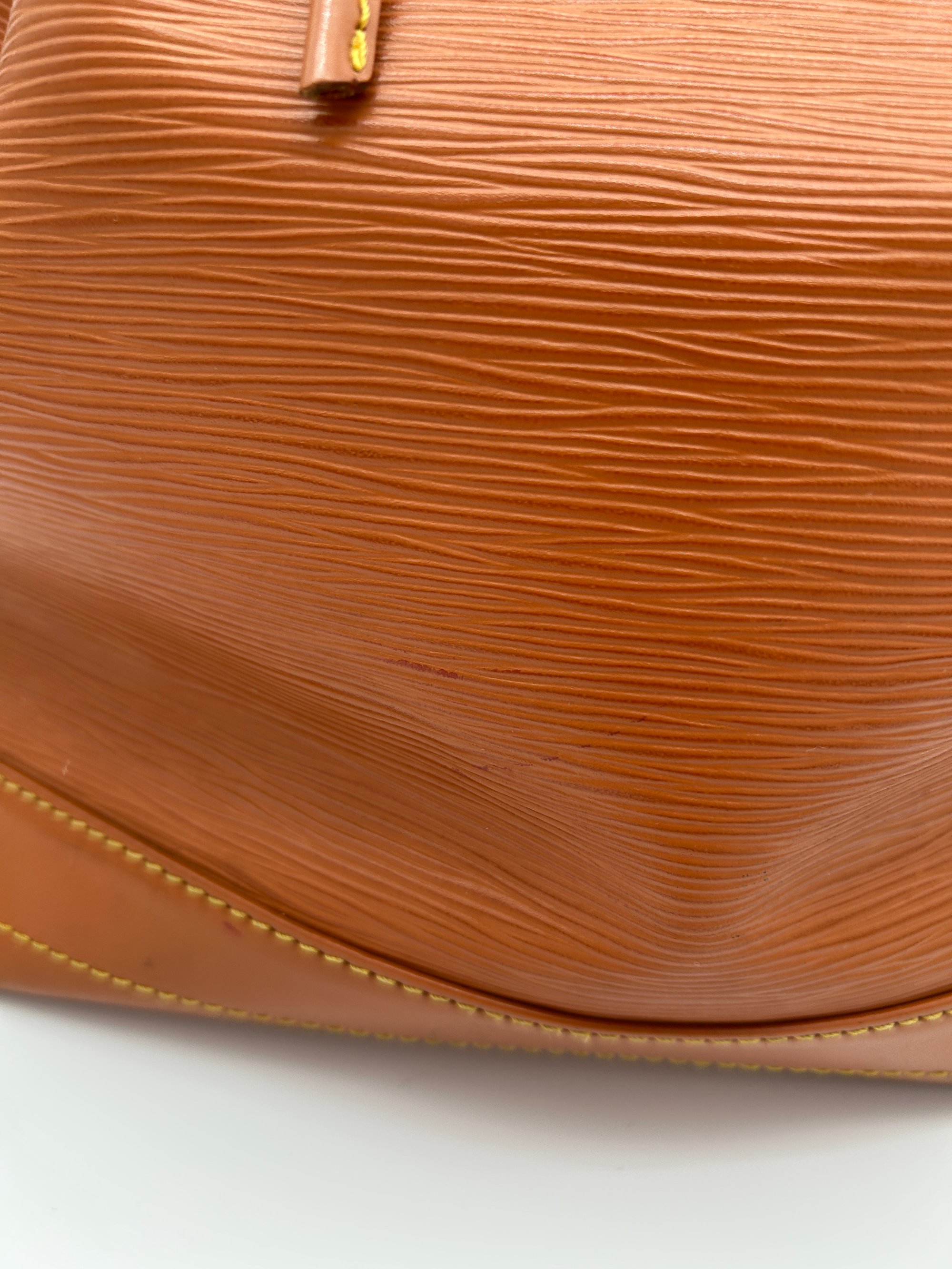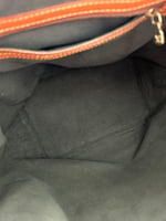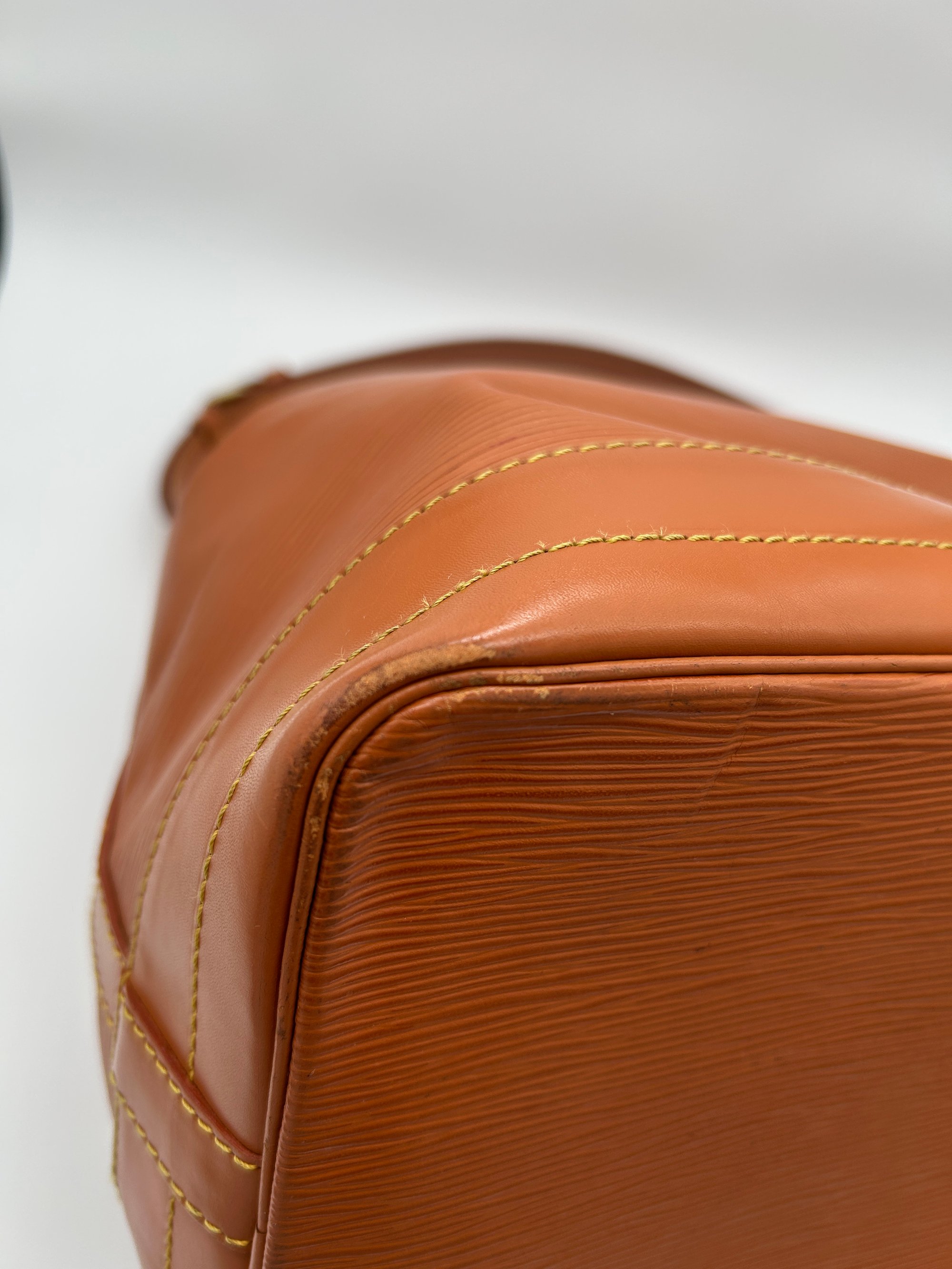 This bag is in very good shape. There is some scuffing on all four bottom corners. There are some scratches and creasing around the bag. The leather strap has some creasing. The metal hardware has discoloured due to its age and wear. The inside is very clean.