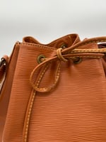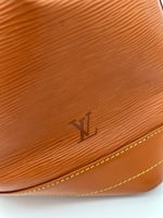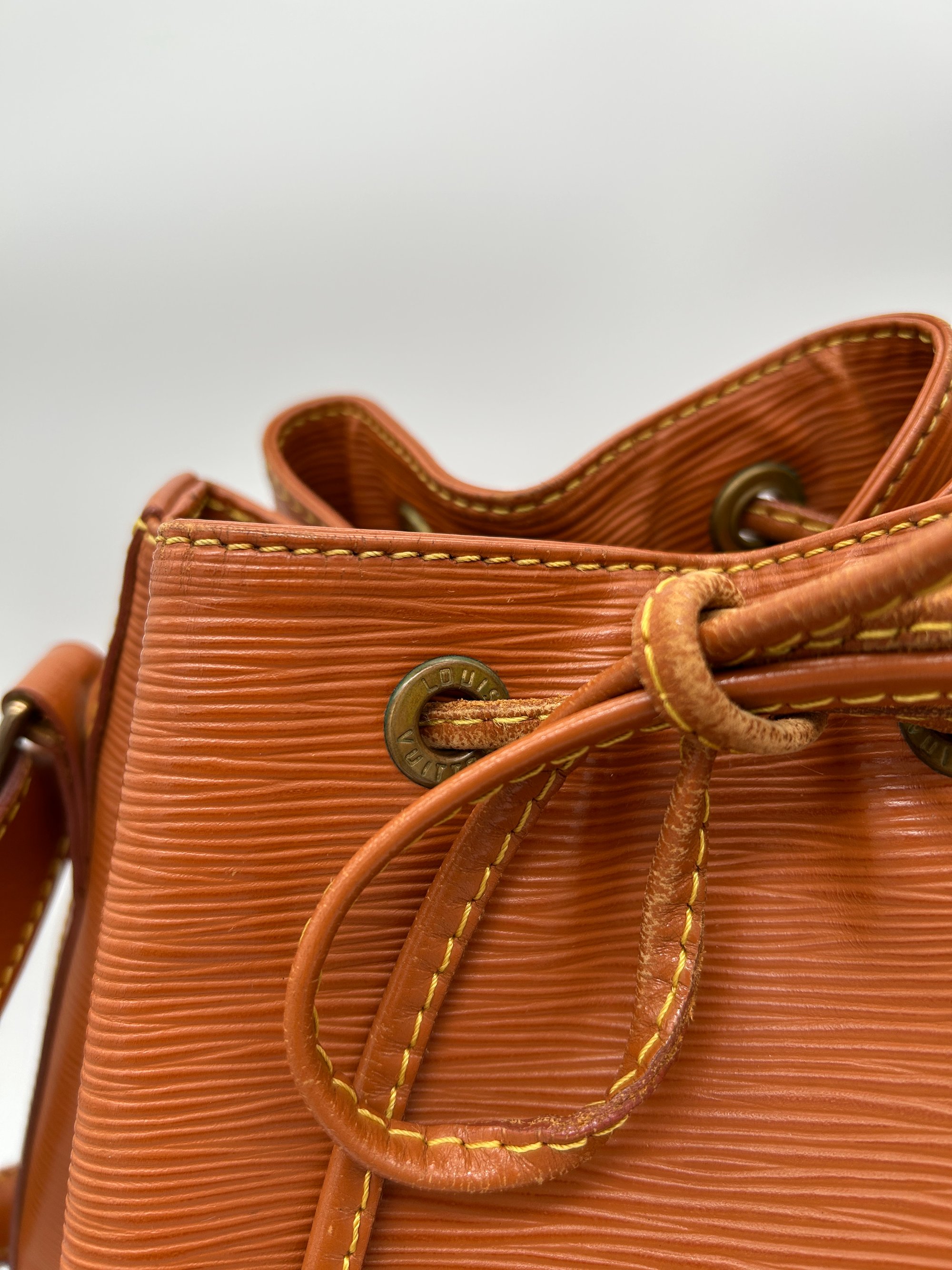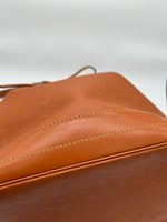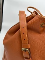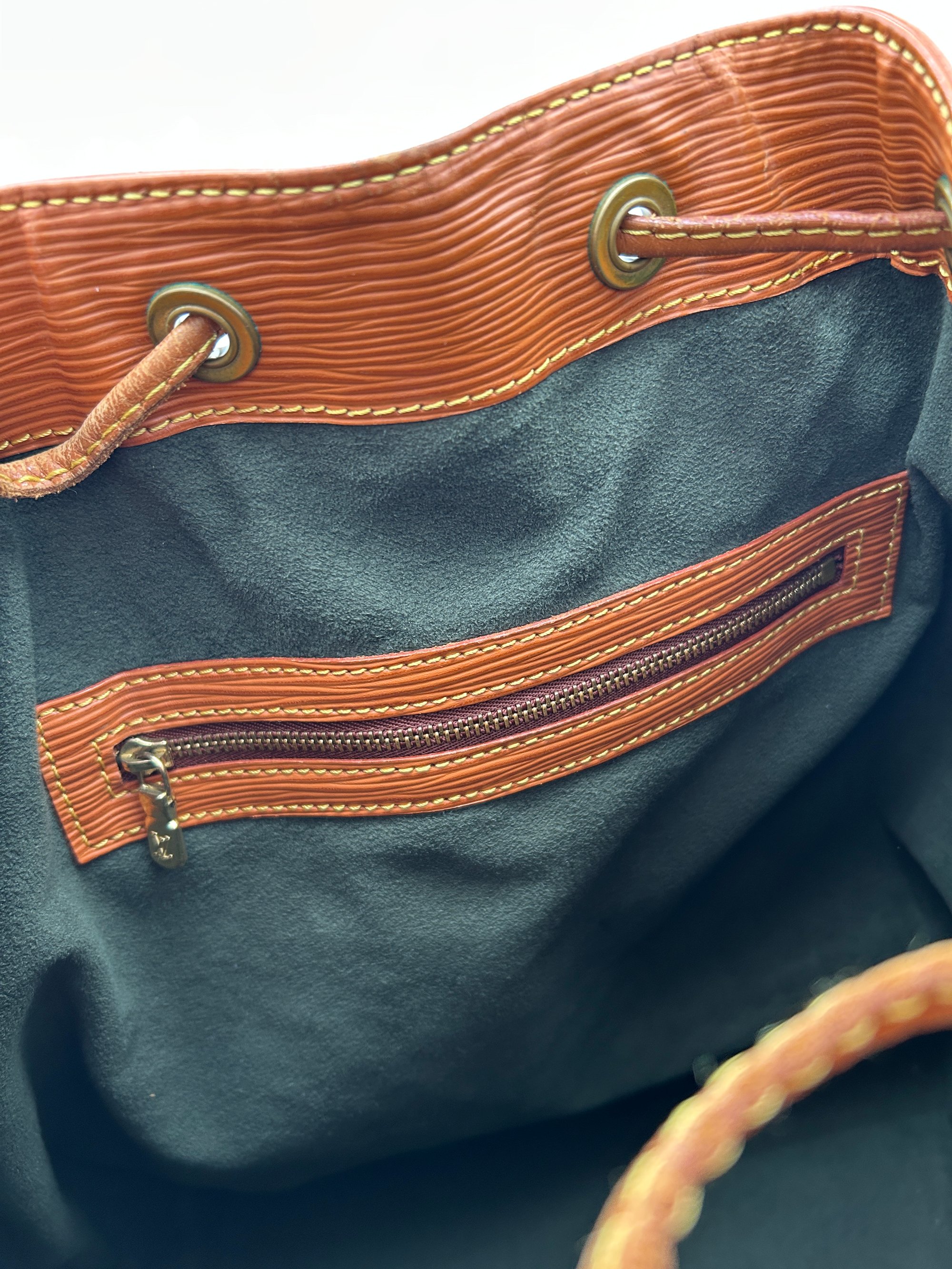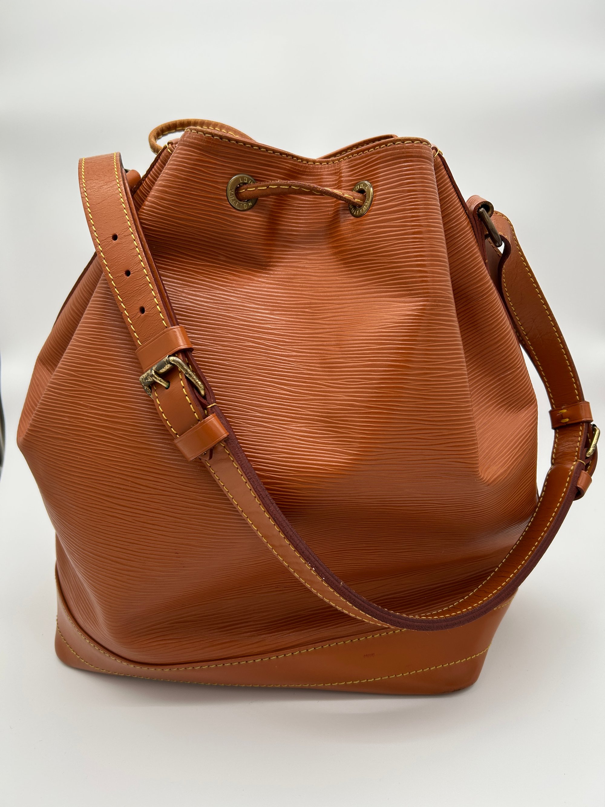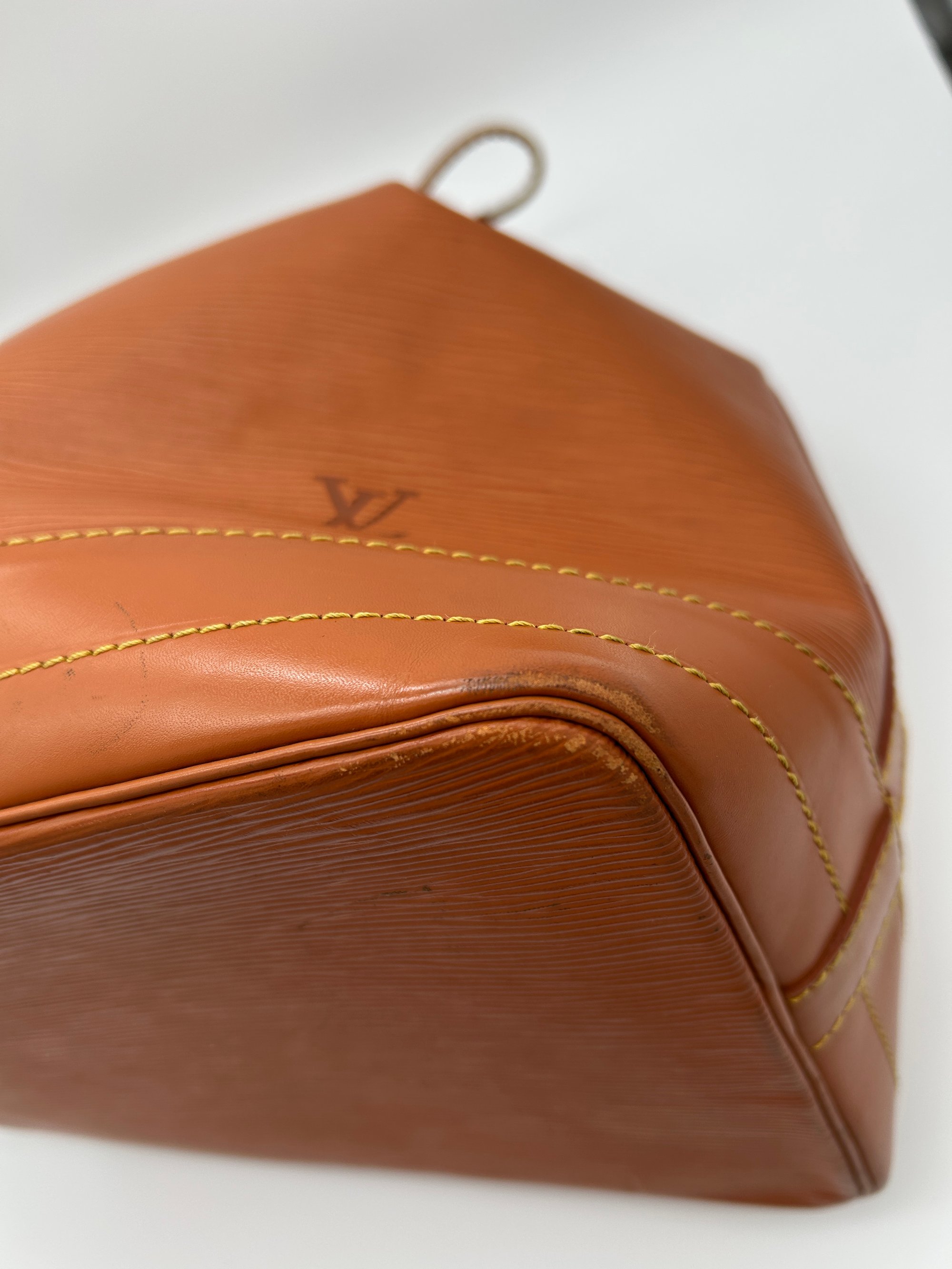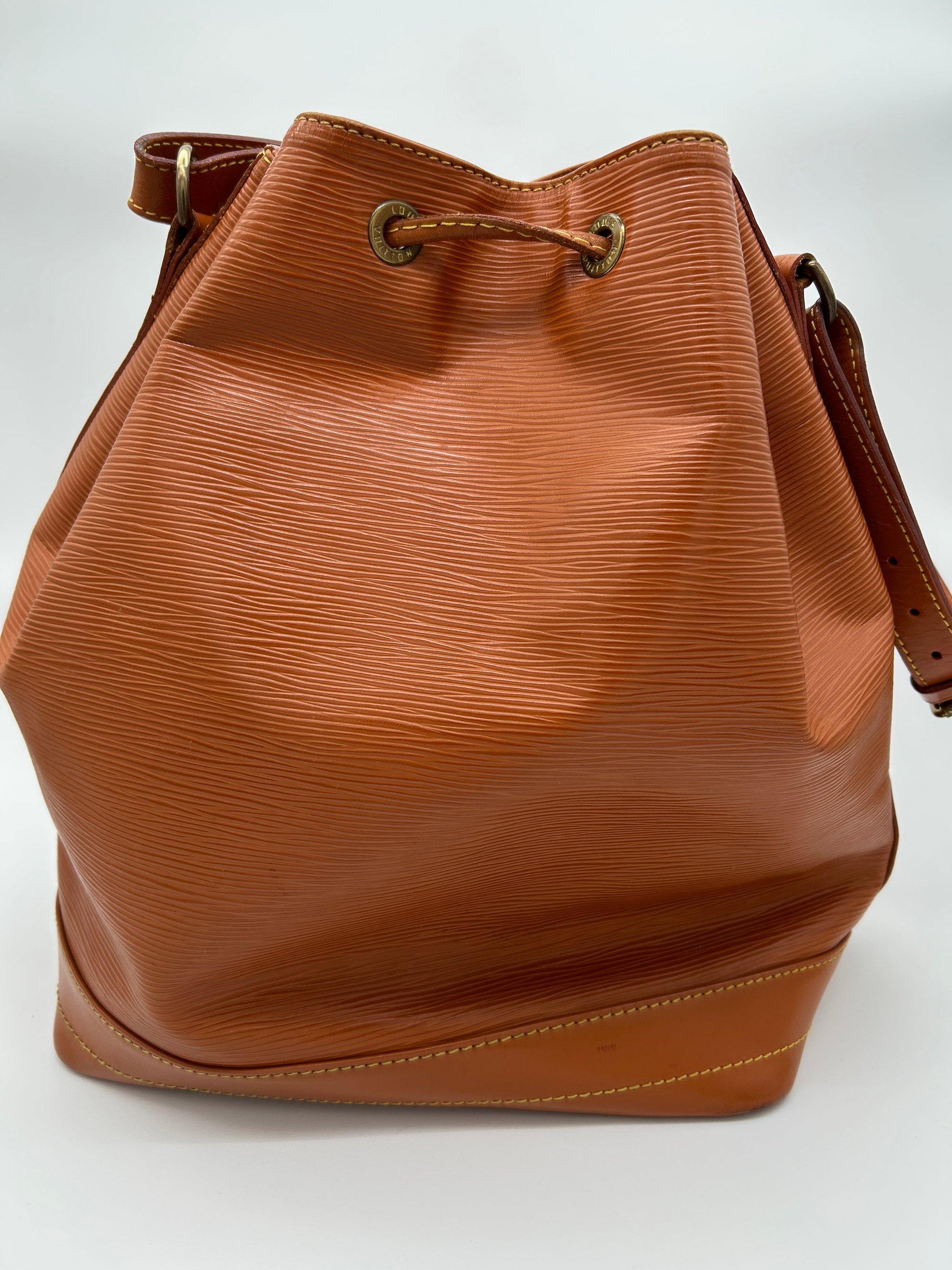 This bag is in very good shape. There is some scuffing on all four bottom corners. There are some scratches and creasing around the bag. The leather strap has some creasing. The metal hardware has discoloured due to its age and wear. The inside is very clean.