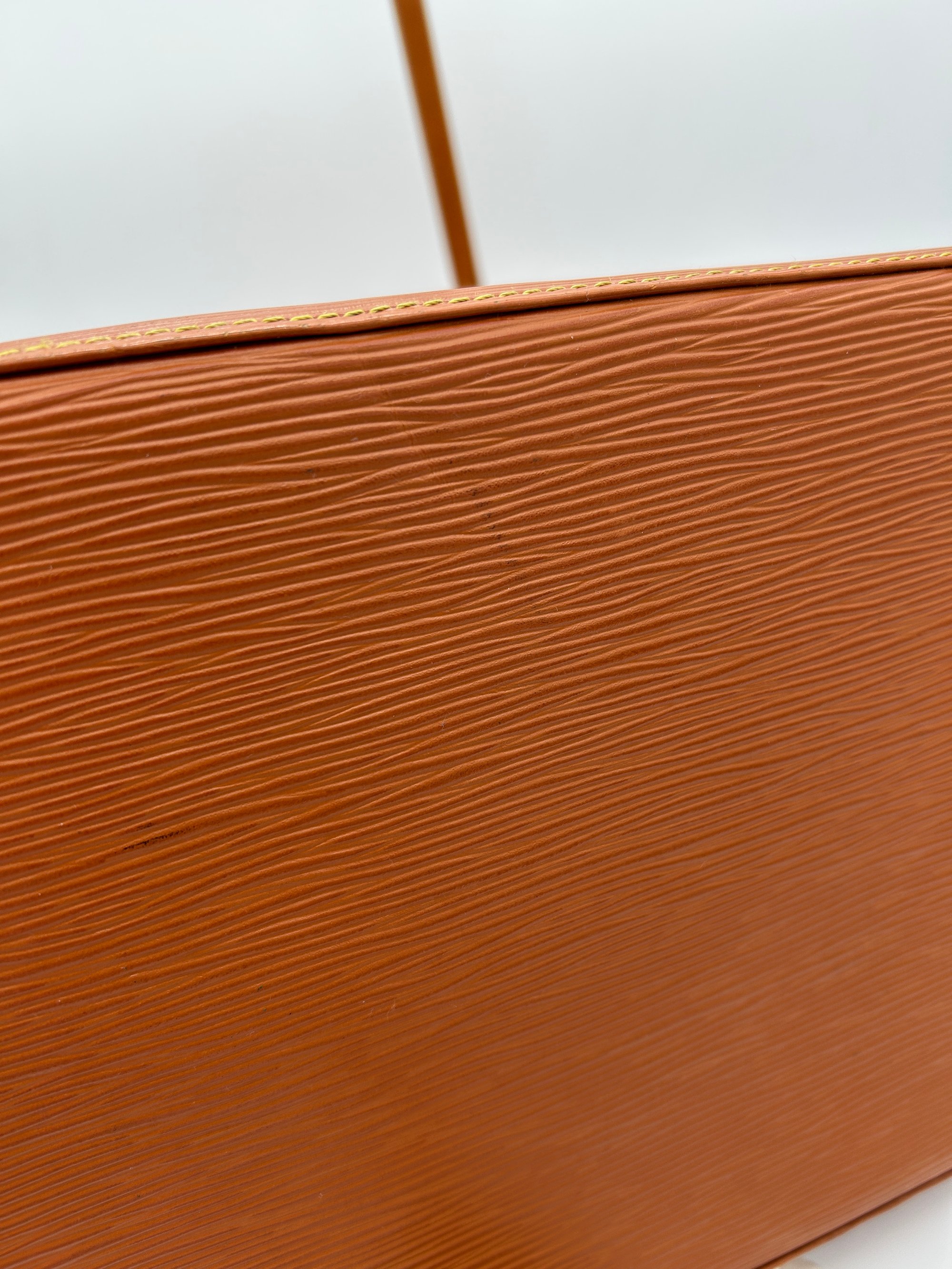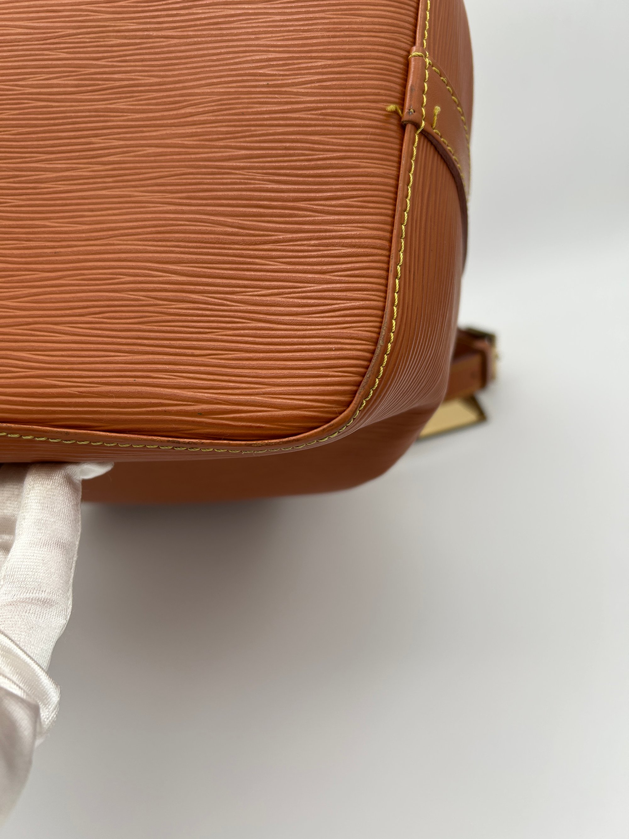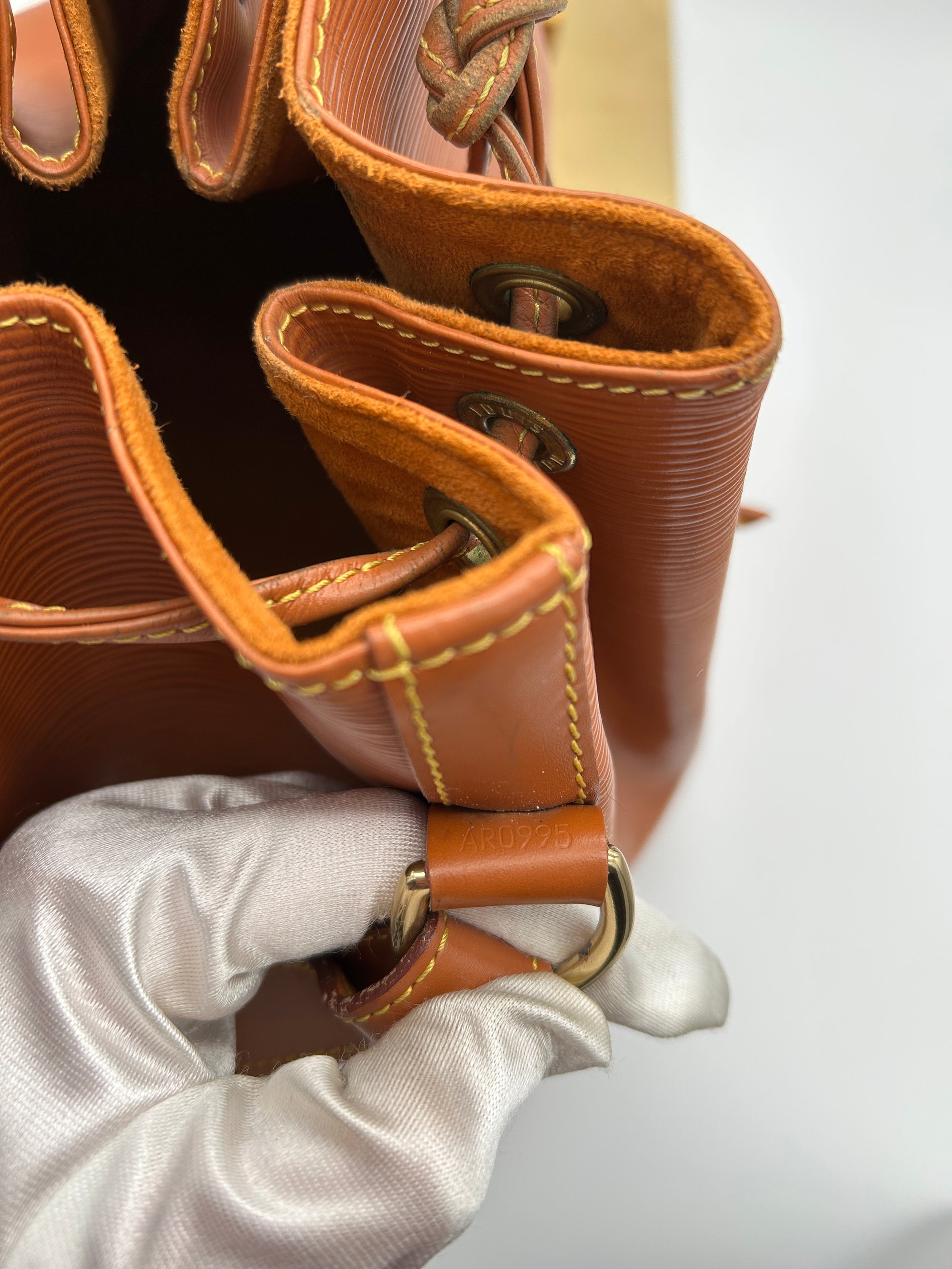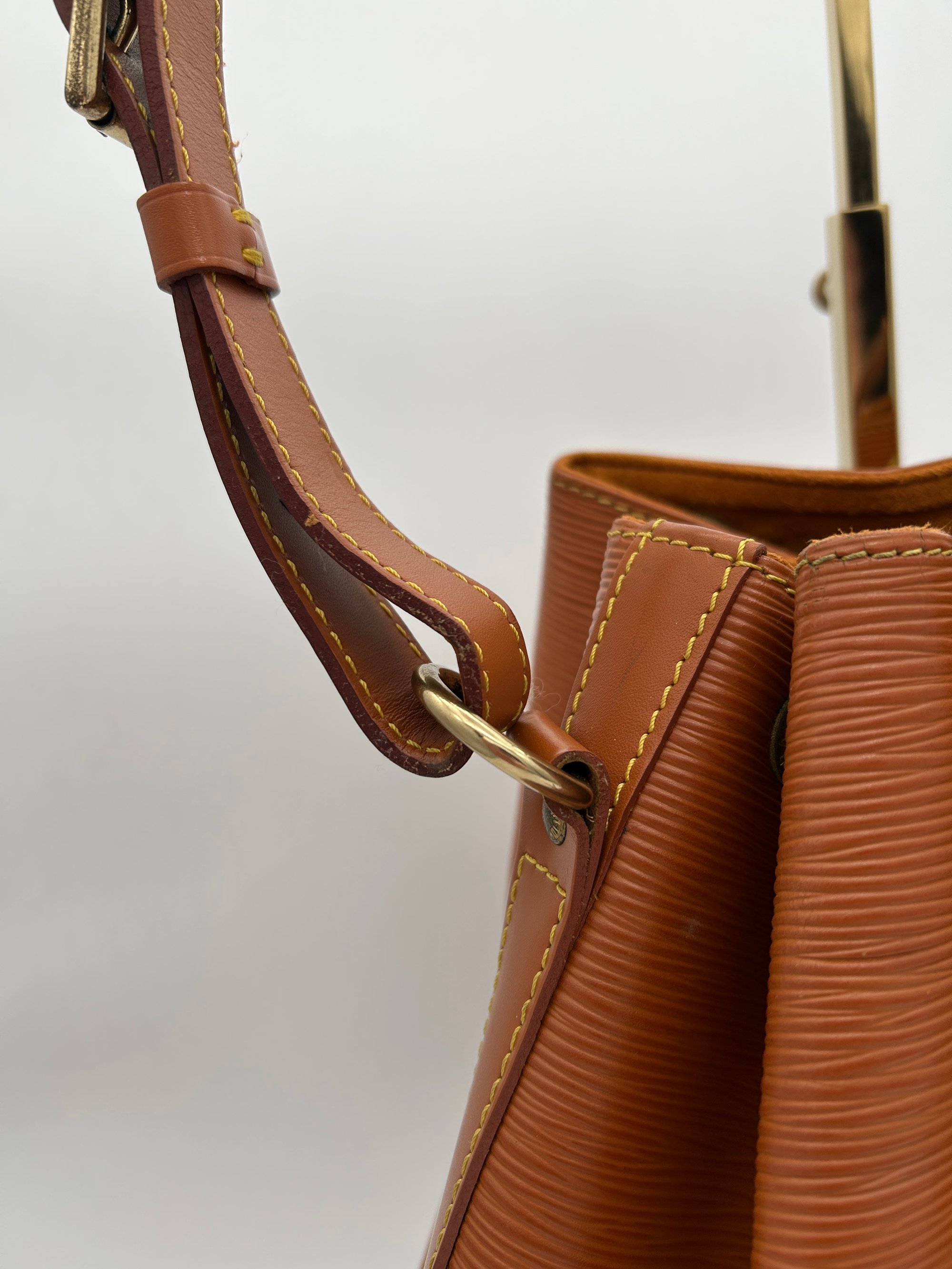 The Epi leather is free of any tears or cracks. The exterior has a few scratches with some minor scuffing on all four bottom corners. The leather string tie has some material wear. The leather strap has some minor creasing and metal hardware has some discolouration. The inside is very clean with a one major stain around the opening of the bag.