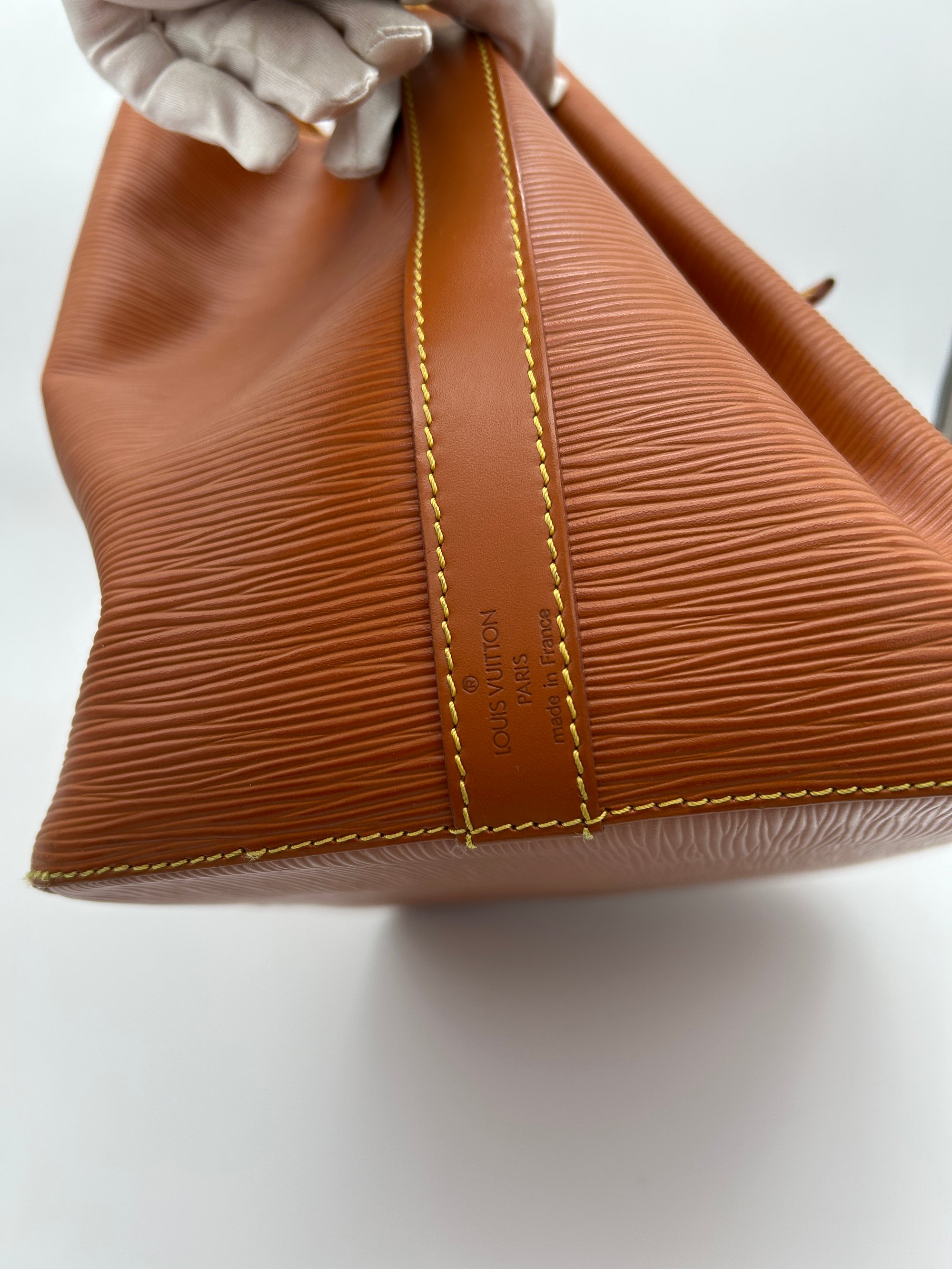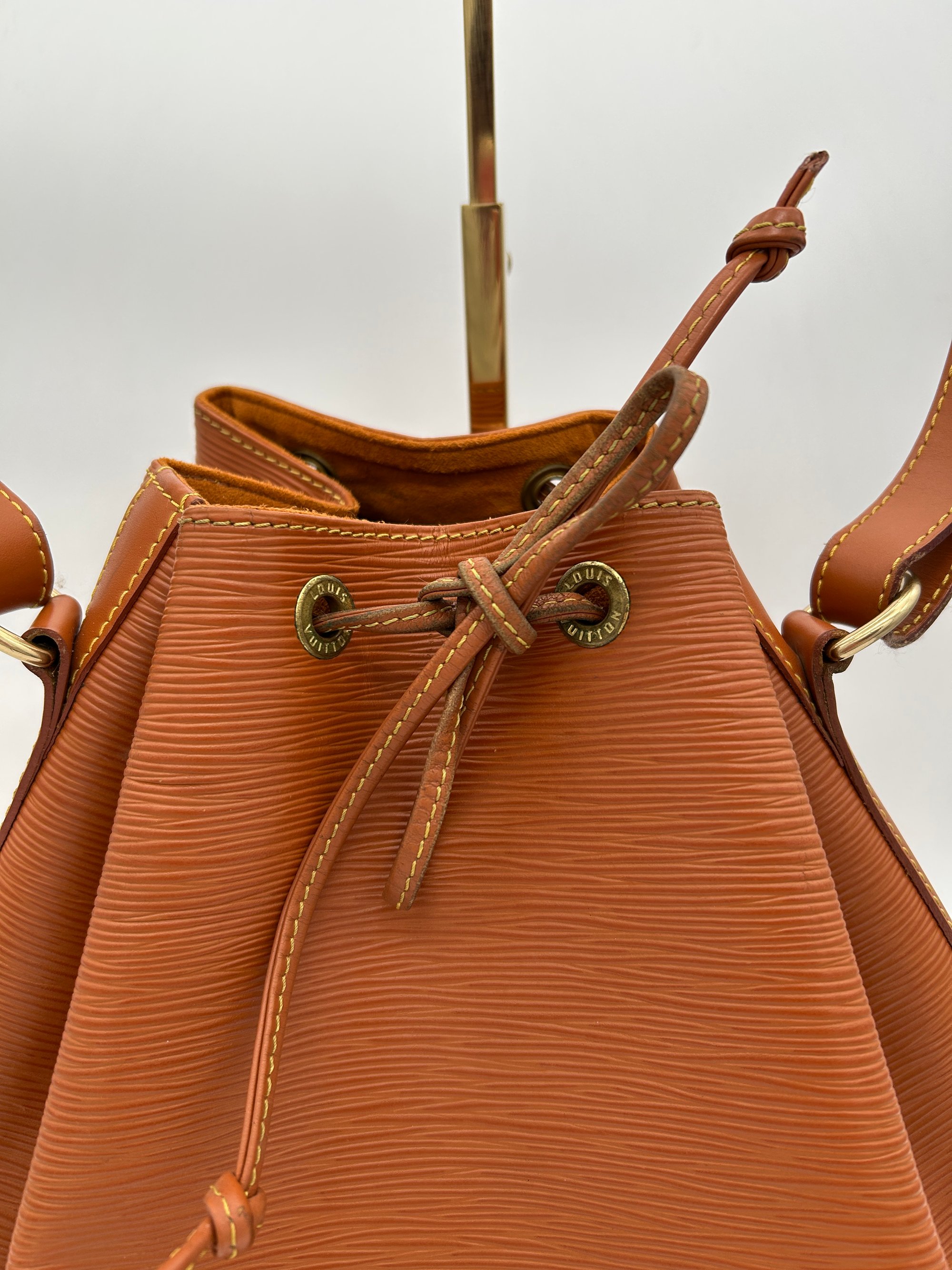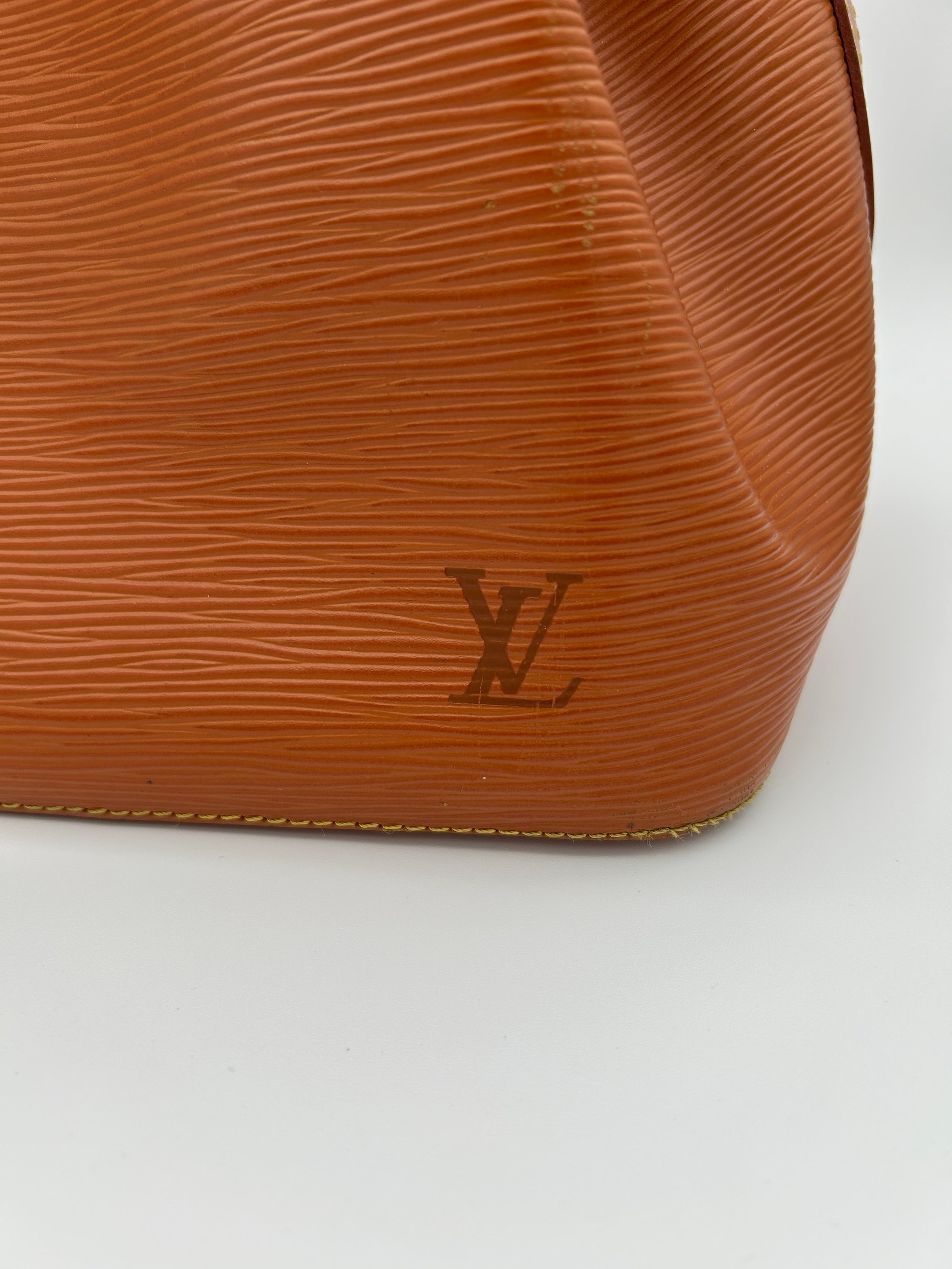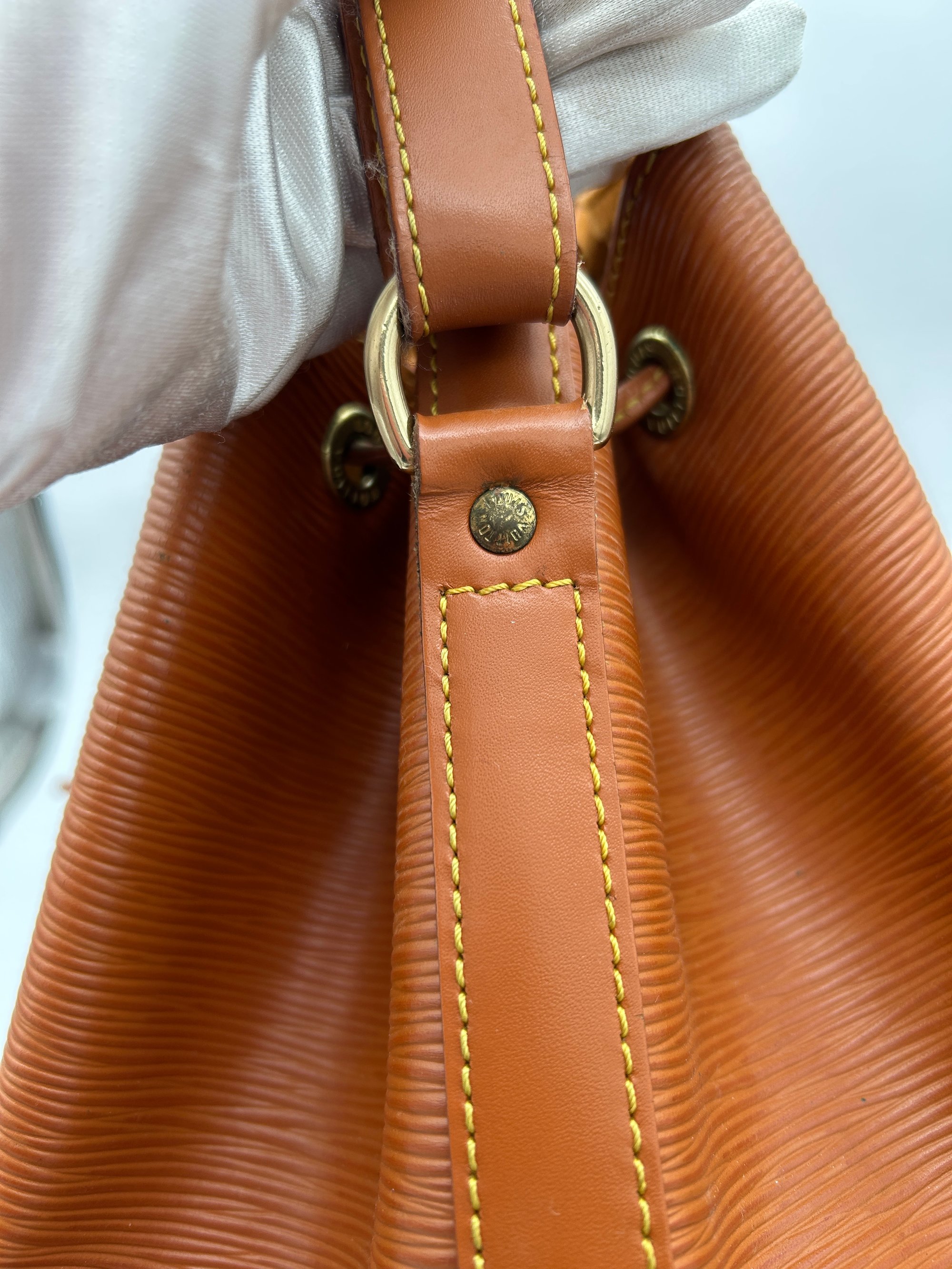 The Epi leather is free of any tears or cracks. The exterior has a few scratches with some minor scuffing on all four bottom corners. The leather string tie has some material wear. The leather strap has some minor creasing and metal hardware has some discolouration. The inside is very clean with a one major stain around the opening of the bag.