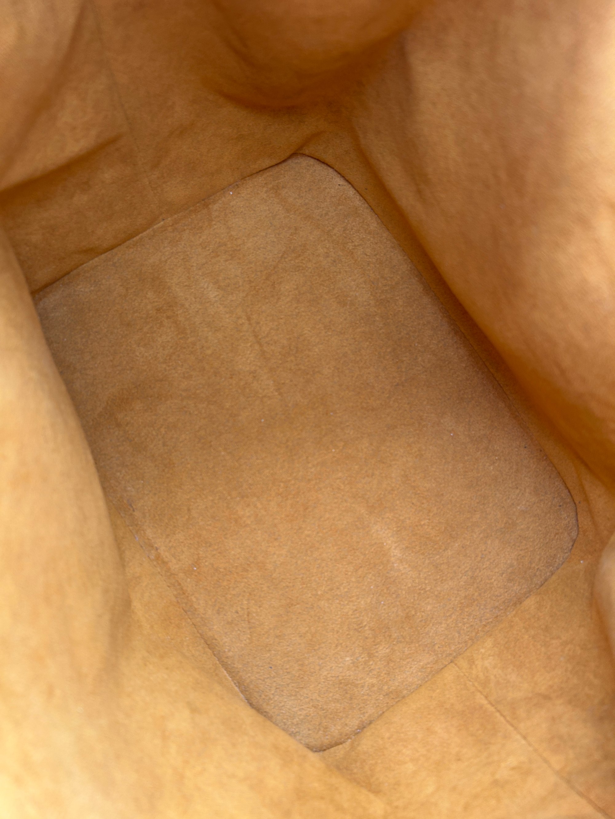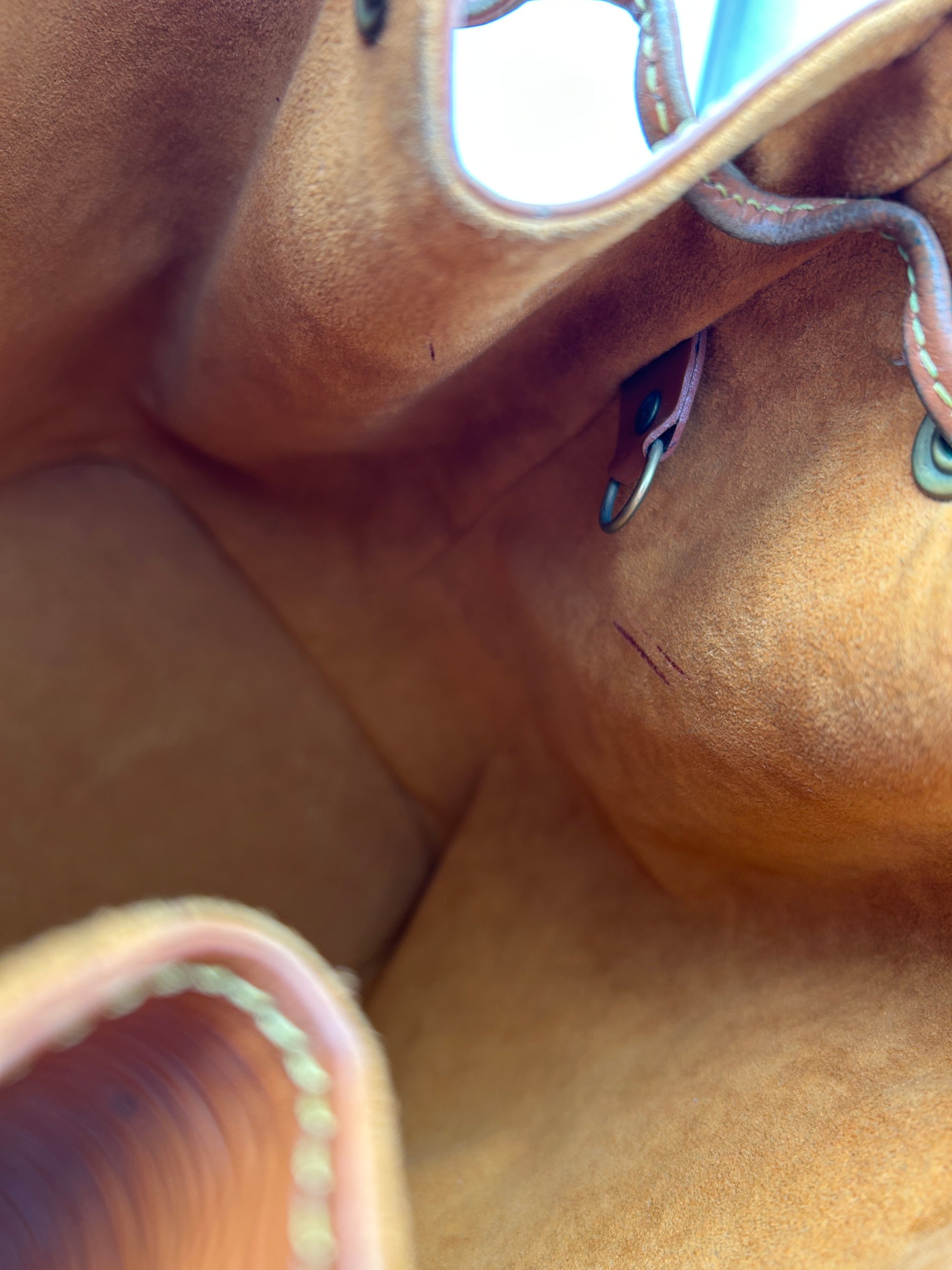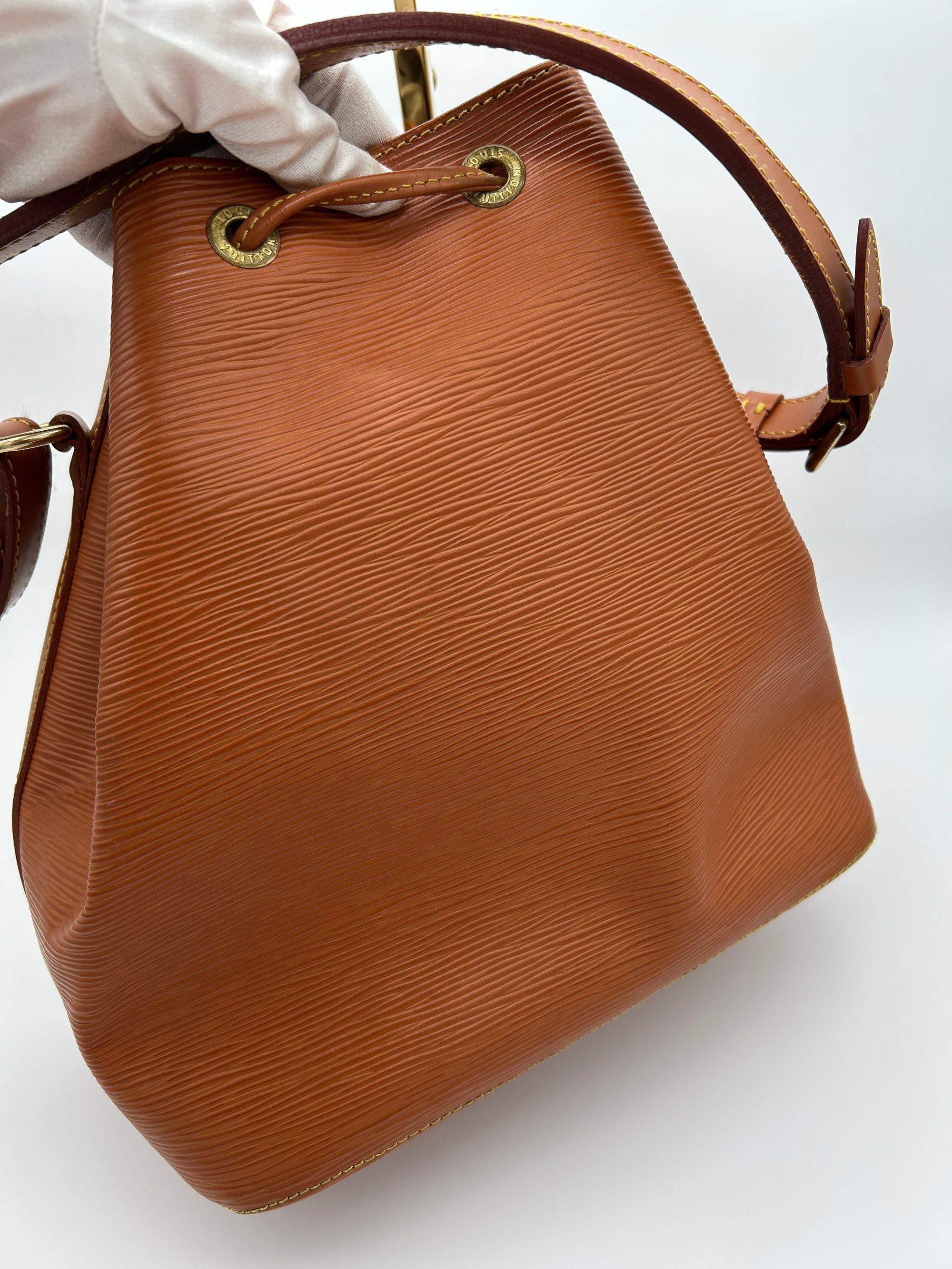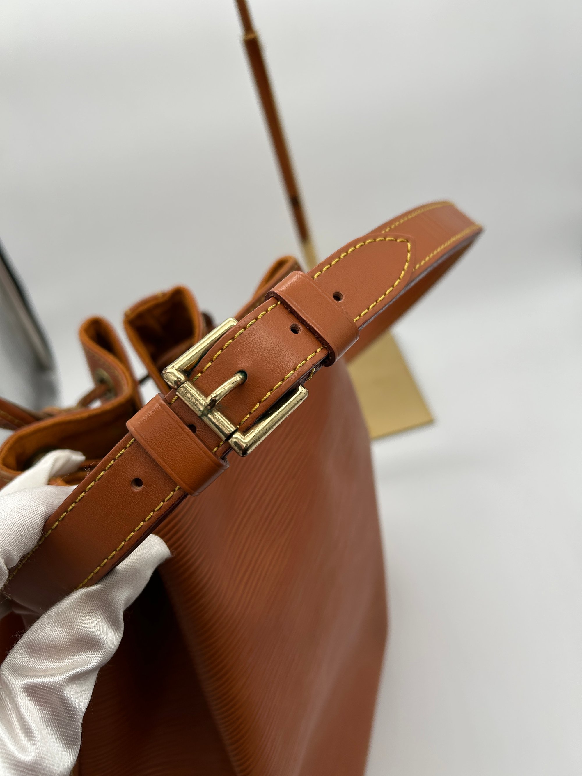 The Epi leather is free of any tears or cracks. The exterior has a few scratches with some minor scuffing on all four bottom corners. The leather string tie has some material wear. The leather strap has some minor creasing and metal hardware has some discolouration. The inside is very clean with a one major stain around the opening of the bag.