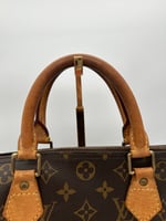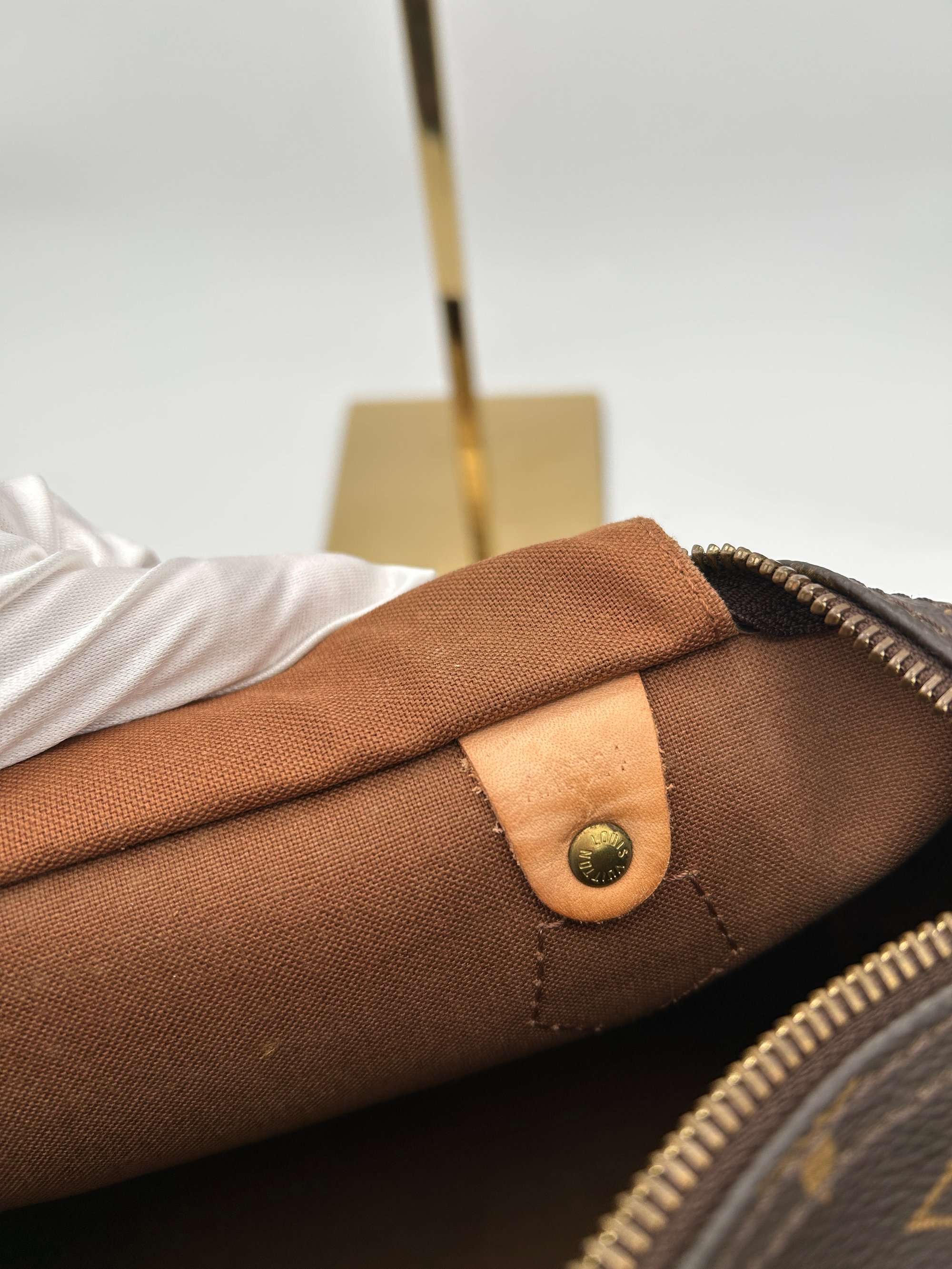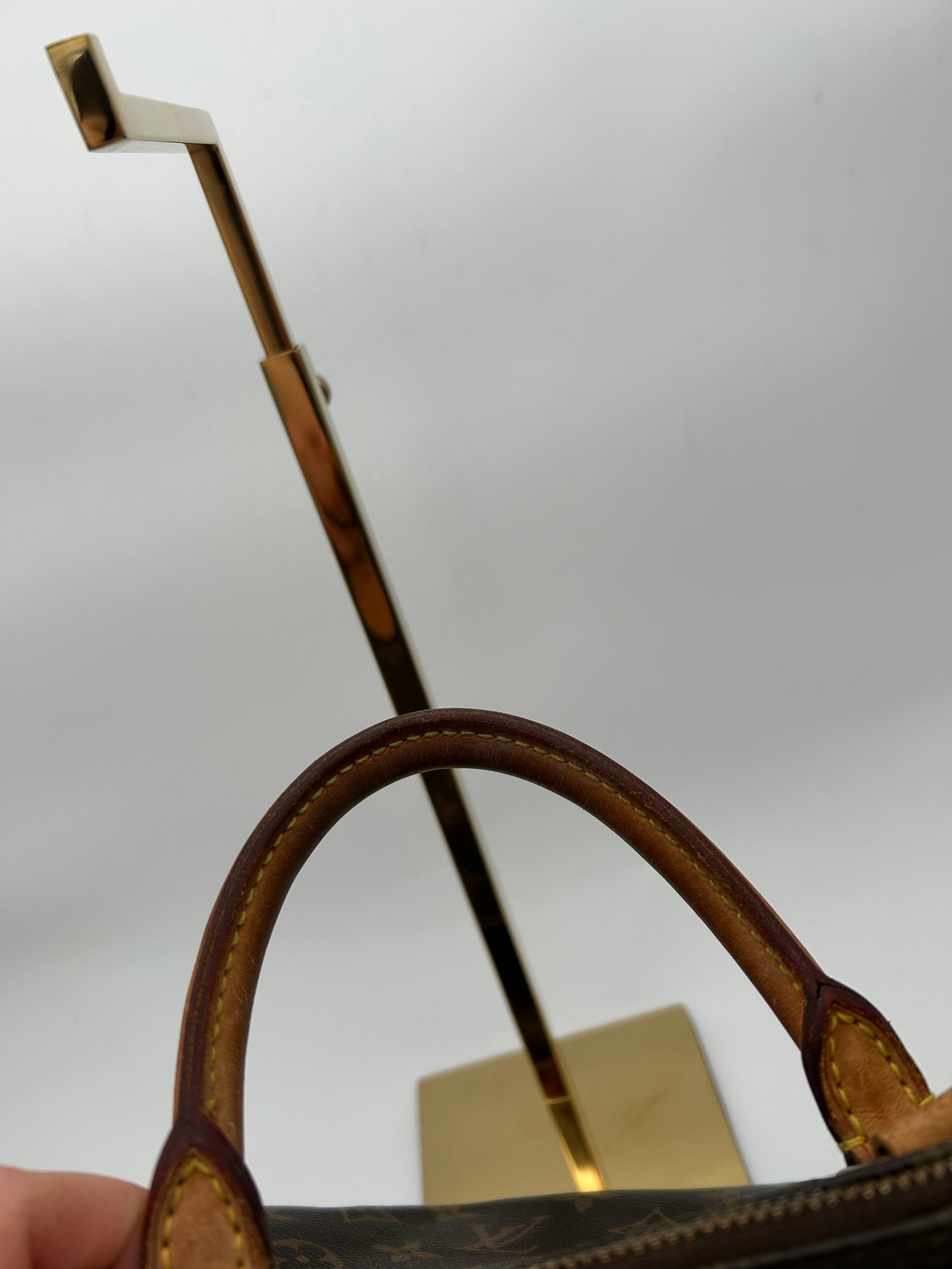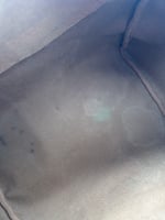 The leather handles have some discolouration and wear. The metal hardware has some discolouration due to age. There is one crack on the canvas, along the zipper. The inside has some staining. There are no holes on this bag.