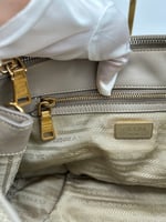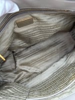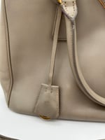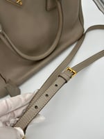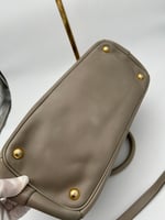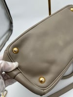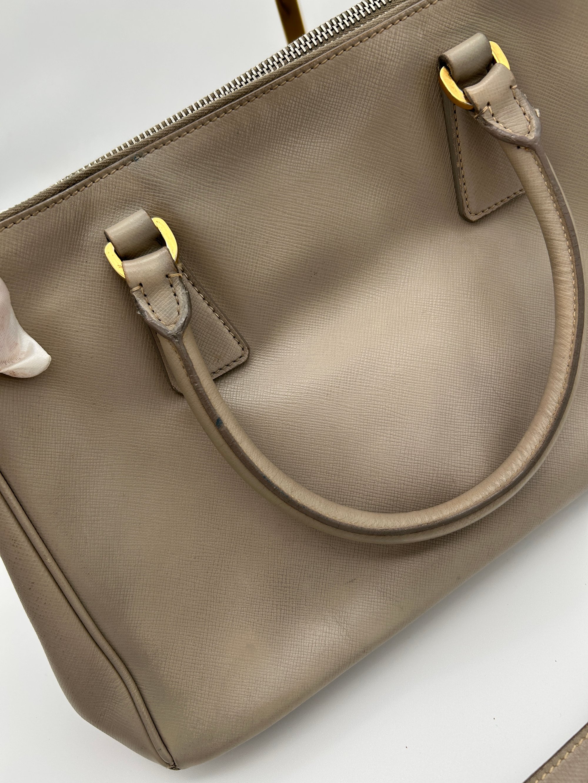 There are a few creases on the leather around the exterior of the bag. The leather handles have some slight signs of wear. The gold studs have some discolouration. The inside is very clean and has no odour. The leather strap is in very good condition.